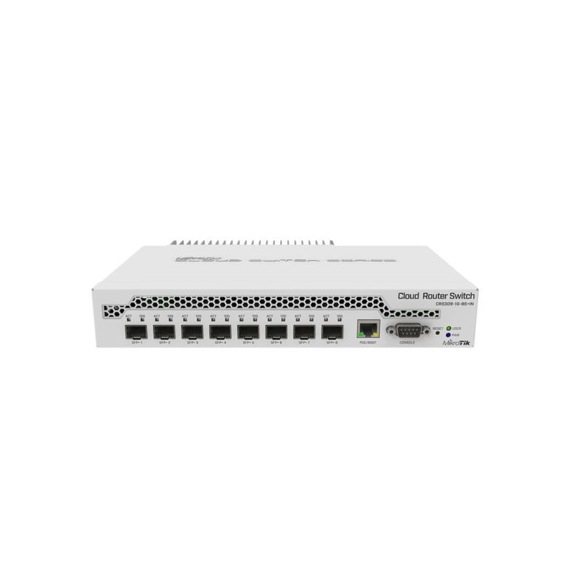 MikroTik CRS309-1G-8S IN, Desktop switch with 8x 10G SFP Slots 1 Gigabit Ethernet ports. Total switching capacity of 162 Gbps and total non-blocking throughput of 81 Gbps. Dual-core 800 MHz CPU, 512 MB RAM, a management Ethernet port with PoE power input, RS232 serial port, a grounding terminal and is capable of dual boot (choose which operating system you prefer, RouterOS, or SwOS).