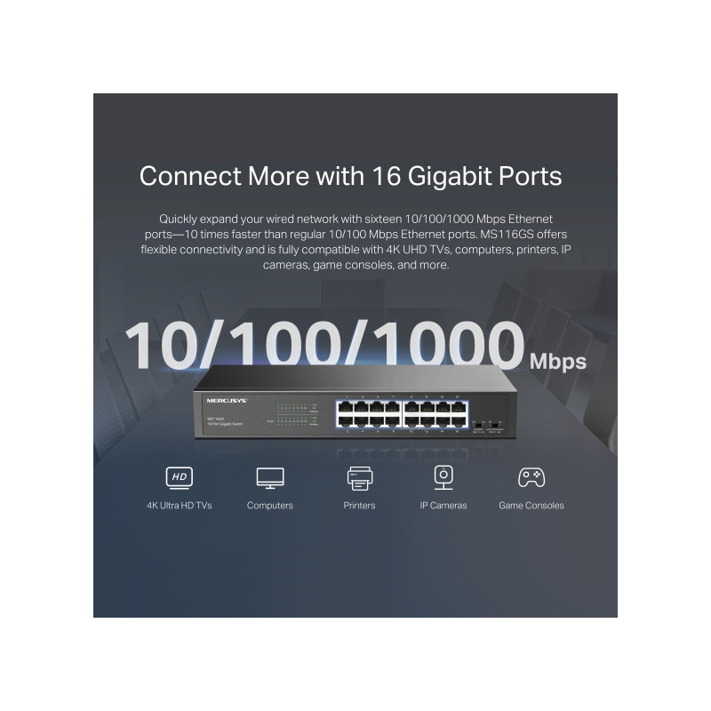 - Puni gigabitni portovi: 16× 10/100/1000 Mbps RJ45 portova s automatskim prepoznavanjem (Auto-Negotiation) i podrškom za Auto-MDI/MDIX