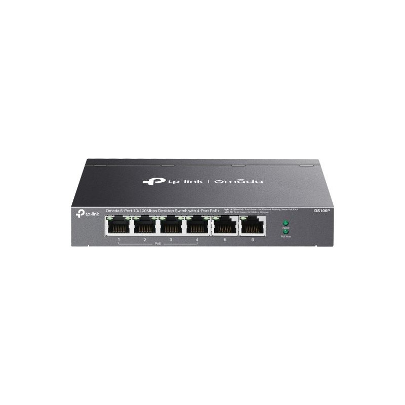 TP-Link DS106P Omada 6-Port 10 100Mbps Unmanaged Desktop Switch with 4-Port PoE 6x 10 100 Mbps RJ45 Ports (ports 1 4 support 802.3af at PoE ) Fanless Jumbo Frame: 2 KB Switching Capacity: 1.2 Gbps Dimensions ( W x D x H ): 158 x 101 x 25 mm Package Content: DS106P, Power Adapter, Installation Guide