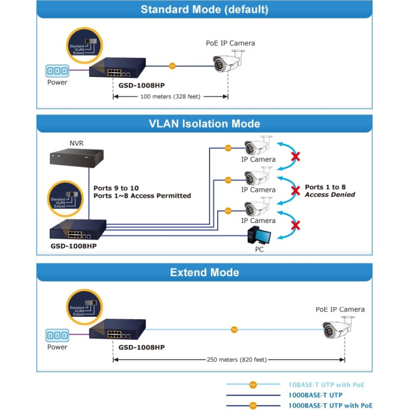- Hardware DIP switch for Standard, VLAN and Extend mode selection; the Extend mode features 30-watt PoE transmit distance of 250m at speed of 10Mbps and VLAN isolation (Only for Port-1 to Port-8)