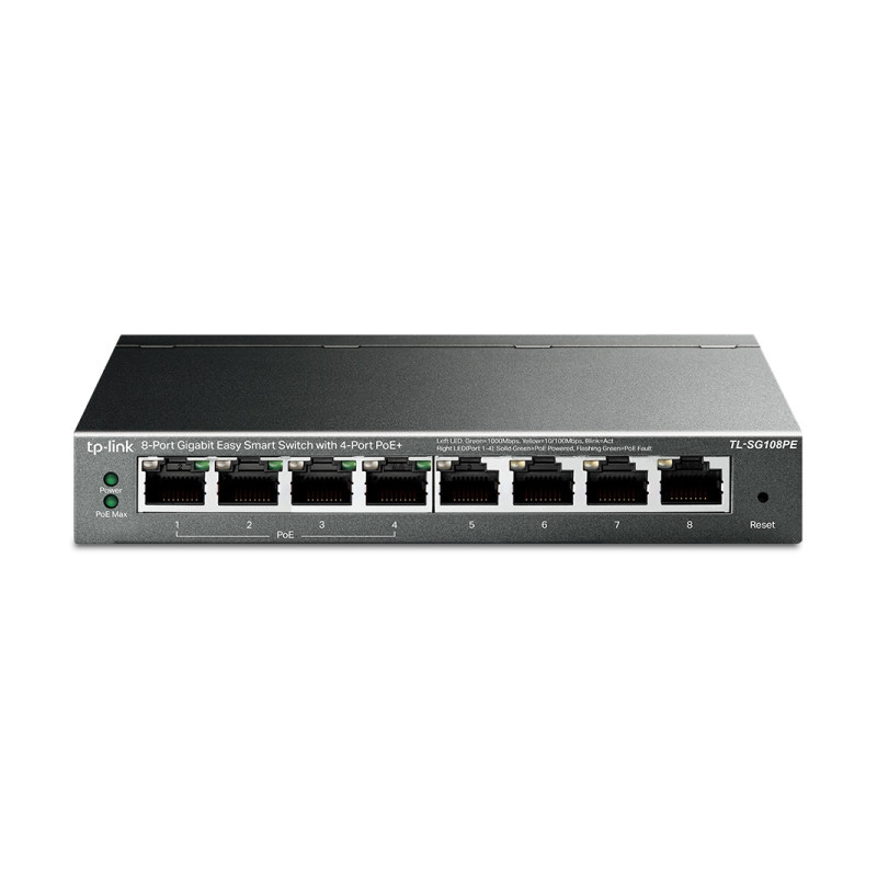 - Package Contents: TL-SG108PE, Power Adapter, Installation Guide, Rubber Feet