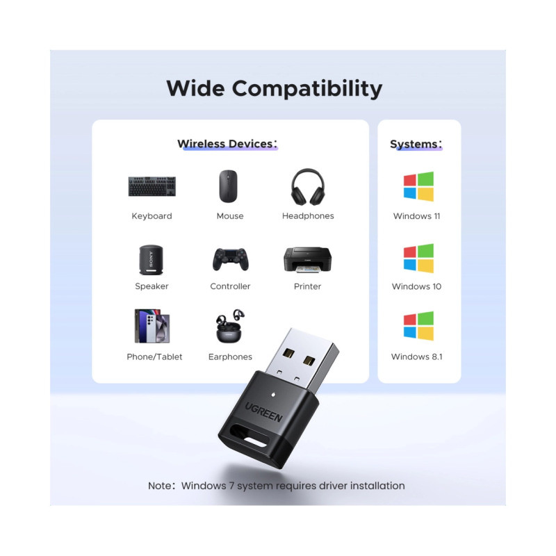 - UGREEN Bluetooth adapter za računalo podržava istovremeno povezivanje do 5 različitih vrsta Bluetooth uređaja bez međusobnog ometanja, kao što su Bluetooth miš/tipkovnica/mobilni telefon/slušalice itd. Ako su povezani Bluetooth audio uređaji iste vrste (kao što su zvučnici/slušalice), samo jedan uređaj može reproducirati glazbu.