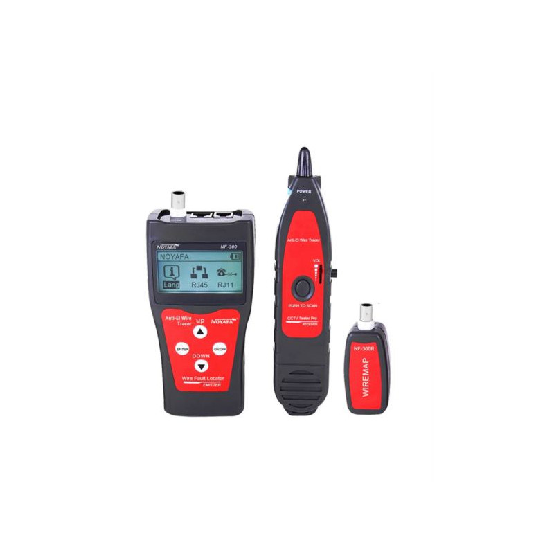 Noyafa NF-300 LCD Cable Tester Support Coax, RJ45, RJ11, USB-A, and Metal Cables - Trace and locate BNC Coax, RJ45 (STP 4-core), RJ11, USB-A, and metal cables, Anti-jamming, capable of working on the exchanger and PC startup, Measure the length of the BNC Coax and RJ45 cables, Test the cable continuity of the BNC Coax, RJ45, and RJ11 such as open, short, cross, and crosstalk, Locate short and breakage points accurately, Earphone permits use in noisy environments