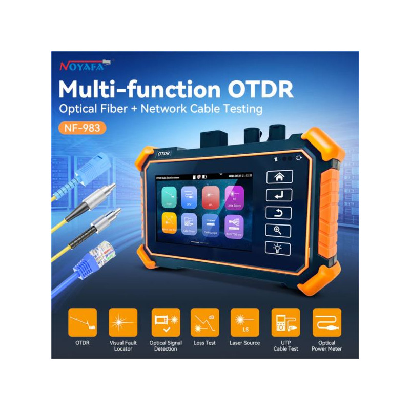 NOYAFA NF-983 Multi-Function OTDR Tester for Optical Fiber Network Cable Testing - Multi-functional Testing: Combines Optical Fiber and Network Cable Testing in one device for increased efficiency, Auto OTDR Test: Automatically sets pulse width and measurement duration, reducing testing time to 5 seconds, Dual Wavelength Support (1310nm 1550nm): Offers flexibility for various fiber testing scenarios with support for two key wavelengths, Optical Power Meter: Measures optical power from -70dBm to 10dBm, ensuring precise and reliable measurements, Visible Fault Locator (VFL): Easily locates fiber faults with strong red light for quick and accurate identification, IP Scan Ping Functions: Includes network tools for testing IP addresses and connectivity, improving network diagnostics, Long Battery Life: Equipped with a 4000mAh built-in lithium battery, ensuring up to 6 hours of continuous use