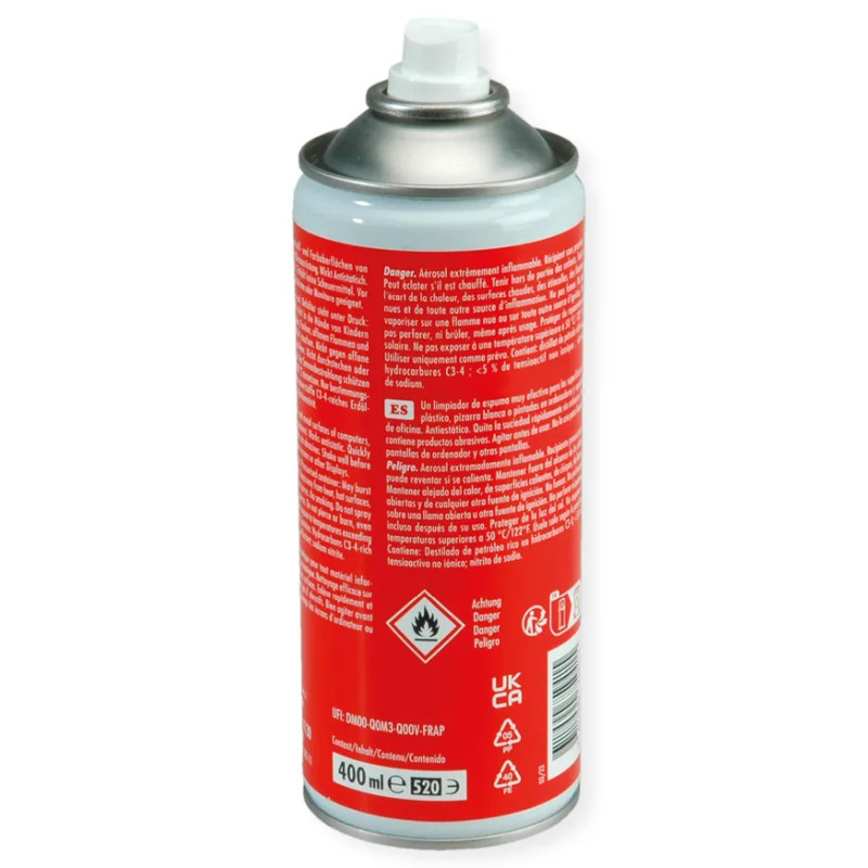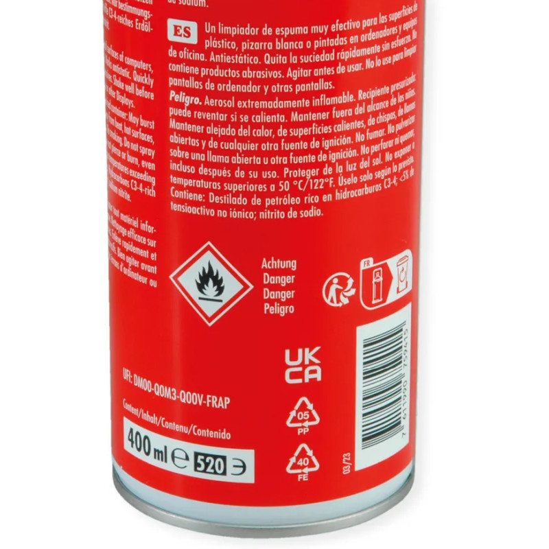 • Pjena za čišćenje plastičnih i metalnih površina računala, bijelih ploča i uredske opreme. Djeluje antistatički. Brzo i lako uklanja prljavštinu. Ne sadrži abrazive. Ne koristiti za čišćenje računalskih zaslona ili drugih zaslona. • Pravilna upotreba: metal/plastika • Vrsta proizvoda: sprej za čišćenje opreme • Volumen: 400 ml • Boja proizvoda: višebojno • Količina u pakiranju: 1 kom • Podaci o pakiranju • Širina pakiranja: 70 mm • Dubina pakiranja: 80 mm • Visina pakiranja: 200 mm • Težina pakiranja: 449 g
