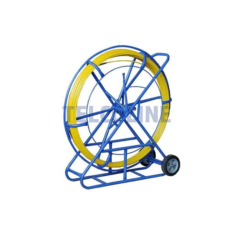 NFO Fiberglass (FRP) remote control for pulling cables, 8mm, 150m, yellow - placed on a special stand to facilitate its unwinding. Fiber with high elasticity and resistance to bending and tearing, covered with yellow PE plastic that has a protective function and ensures good sliding properties. Blue powder-coated fiber frame and a special "eye" for fiber guidance. The stand's design ensures functional transport, storage and use. The end of the fiber ends with a guide head Application: - Pulling cables between telecommunication manholes; Pushing cables under roads; Installations in suspended ceilings; Cleaning and unblocking pipes, culverts, sewage systems; Inserting cables into protective pipes Technical data: Dimensions: 115x45x125 cm Outer diameter (with cover): 8 mm Length: 150 m Weight (with frame): approx. 25 kg