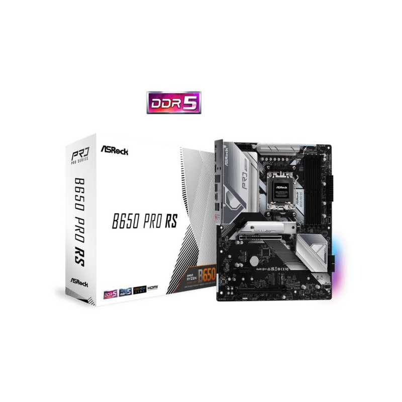 Asrock AMD AM5 B650 PRO RS - Supports AMD Socket AM5 Ryzen 9000, 8000 and 7000 Series Processors 14 2 1 Phase Power Design, SPS 4 x DDR5 DIMMs, supports up to 6200 (OC) 1 PCIe 4.0 x16, 1 PCIe 3.0 x16, 1 PCIe 4.0 x1, 1 M.2 Key-E for WiFi Graphics Output Options: 1 HDMI, 1 DisplayPort 7.1 CH HD Audio (Realtek ALC897 Audio Codec), Nahimic Audio 1 Blazing M.2 (PCIe Gen5x4), 1 Hyper M.2 (PCIe Gen4x4), 1 M.2 (PCIe Gen3x2 SATA3), 4 SATA3 1 USB 3.2 Gen2x2 Type-C (Front), 1 USB 3.2 Gen2 Type-C (Rear), 1 USB 3.2 Gen2 Type-A (Rear), 4 USB 3.2 Gen1 (2 Rear, 2 Front), 9 USB 2.0 (6 Rear, 3 Front) Realtek 2.5G LAN