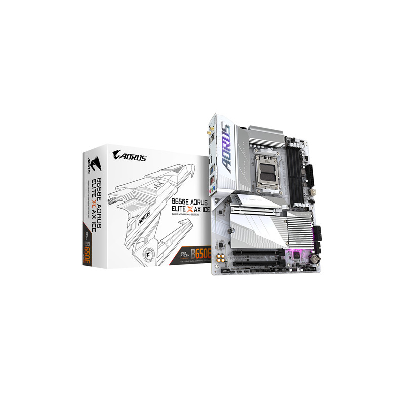 Gigabyte B650E AORUS ELITE X AX ICE. Proizvođač procesora: AMD, Utor za procesor: Utor AM5, Kompatibilni procesori: AMD Ryzen™ 7. Podržani tipovi memorije: DDR5-SDRAM, Maksimalna količina interne memorije: 192 GB, Tip memorijskih utora: DIMM. Podržana sučelja pogona za pohranu: M.2, SATA III, Podržani tipovi pogona: HDD & SSD, RAID tipovi: 0, 1, 5, 10. Maksimalna razlučivost: 4096 x 2160 pikseli. Vrsta Ethernet sučelja: 2.5 Gigabit Ethernet, Vrhunski Wi-Fi standard: Wi-Fi 6E (802.11ax), Wi-Fi standarde: 802.11a, 802.11b, 802.11g, Wi-Fi 4 (802.11n), Wi-Fi 5 (802.11ac), Wi-Fi 6 (802.11ax)