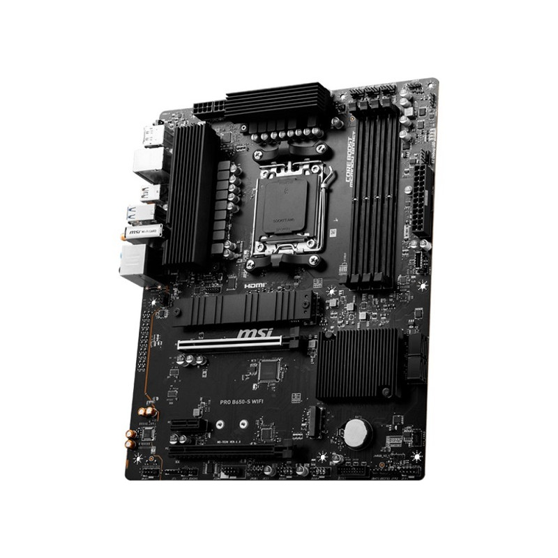 The MSI PRO B650-S WIFI is based on the AMD B650 chipset and supports AMD processors for socket AM5. It has four DDR5 slots for up to 192 GB of memory