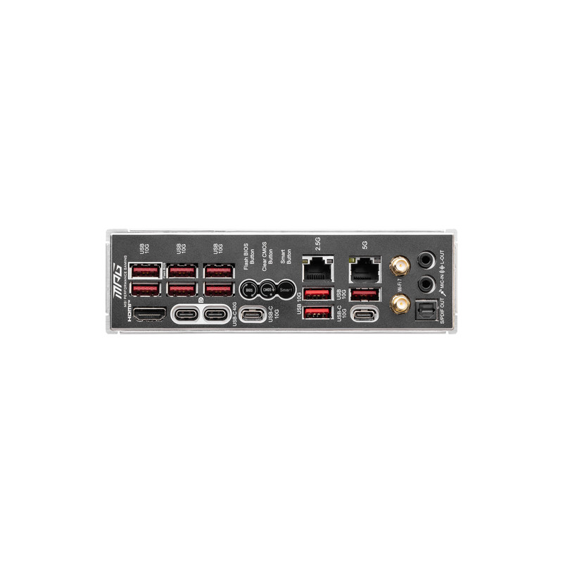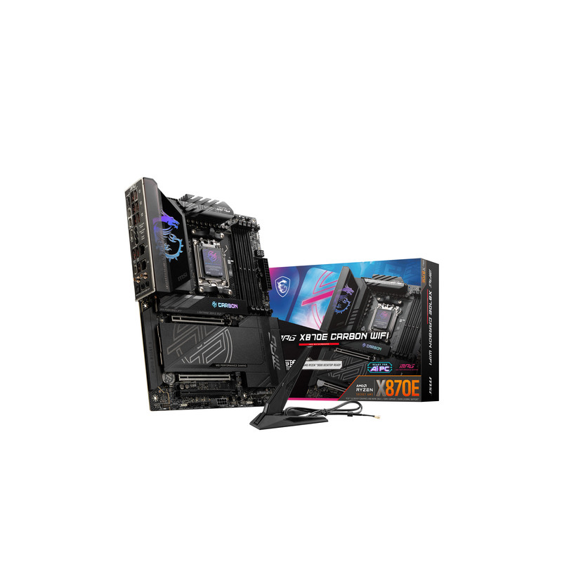 MSI MPG X870E CARBON WIFI. Proizvođač procesora: AMD, Utor za procesor: Utor AM5, Kompatibilni procesori: AMD Ryzen™ 7. Podržani tipovi memorije: DDR5-SDRAM, Maksimalna količina interne memorije: 256 GB, Tip memorijskih utora: DIMM. Podržana sučelja pogona za pohranu: M.2, SATA III, Podržani tipovi pogona: HDD & SSD. Vrsta Ethernet sučelja: 2.5 Gigabit Ethernet, Vrhunski Wi-Fi standard: Wi-Fi 7 (802.11be), Wi-Fi standarde: Wi-Fi 7 (802.11be). Komponenta za: PC/osobno računalo, Dimenzije matične ploče: ATX, Obitelj čipseta matične ploče: AMD