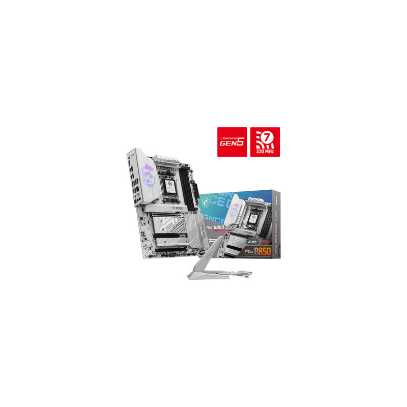 MSI MPG B850 EDGE TI WIFI. Proizvođač procesora: AMD, Utor za procesor: Utor AM5, Kompatibilni procesori: AMD Ryzen 7000 Series, AMD Ryzen 8000 Series, AMD Ryzen 9000 Series. Podržani tipovi memorije: DDR5-SDRAM, Maksimalna količina interne memorije: 256 GB, Tip memorijskih utora: DIMM. Podržana sučelja pogona za pohranu: M.2, Micro SATA III, Podržani tipovi pogona: HDD & SSD, RAID tipovi: 0, 1, 10. Vrsta Ethernet sučelja: 2.5 Gigabit Ethernet, Vrhunski Wi-Fi standard: Wi-Fi 7 (802.11be), Wi-Fi standarde: 802.11a, 802.11b, 802.11g, Wi-Fi 4 (802.11n), Wi-Fi 5 (802.11ac), Wi-Fi 6 (802.11ax), Wi-Fi 6E.... Komponenta za: PC/osobno računalo, Dimenzije matične ploče: ATX, Obitelj čipseta matične ploče: AMD