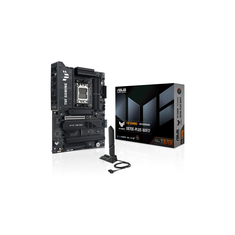 ASUS TUF GAMING X870E-PLUS WIFI7. Proizvođač procesora: AMD, Utor za procesor: Utor AM5, Kompatibilni procesori: AMD Ryzen 7000 Series, AMD Ryzen 8000 Series, AMD Ryzen 9000 Series. Podržani tipovi memorije: DDR5-SDRAM, Maksimalna količina interne memorije: 256 GB, Tip memorijskih utora: DIMM. Podržana sučelja pogona za pohranu: M.2, PCI Express 4.0, PCI Express 5.0, SATA III, Podržani tipovi pogona: HDD & SSD, RAID tipovi: 0, 1, 5, 10. Vrsta Ethernet sučelja: 2.5 Gigabit Ethernet, Vrhunski Wi-Fi standard: Wi-Fi 7 (802.11be), Wi-Fi standarde: Wi-Fi 7 (802.11be). Komponenta za: PC/osobno računalo, Dimenzije matične ploče: ATX, Obitelj čipseta matične ploče: AMD