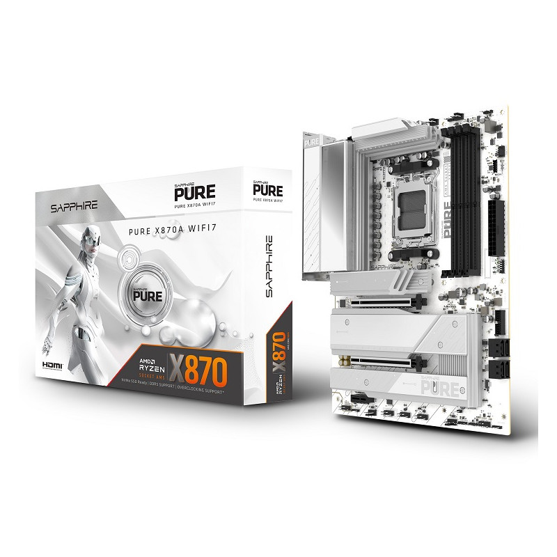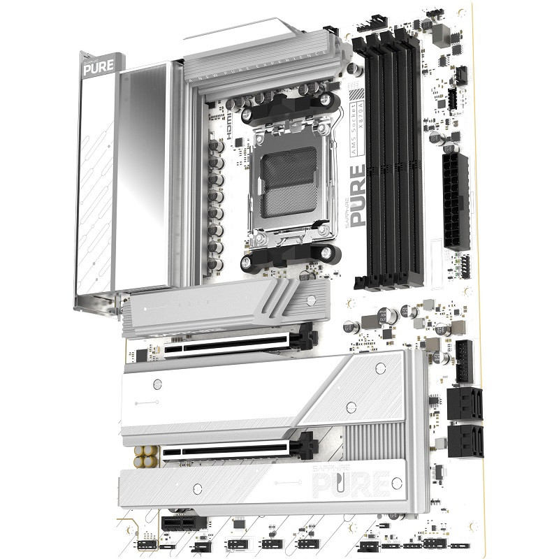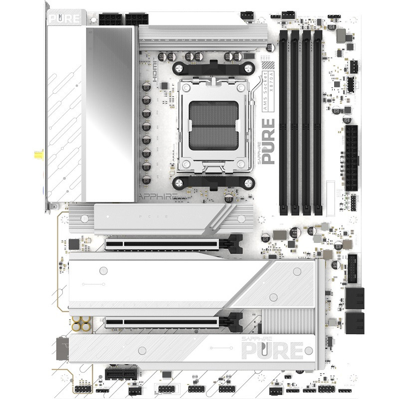 The SAPPHIRE PURE X870A WIFI 7 is based on the AMD X870 chipset and supports AMD processors for socket AM5. It features four DDR5 slots for up to 256 GB of RAM. features of the SAPPHIRE PURE X870A WIFI 7 include one PCIe 5.0 x16 slot, one PCIe 4.0 x16 slot (x4 lanes), and one PCIe 3.0 x1 slot