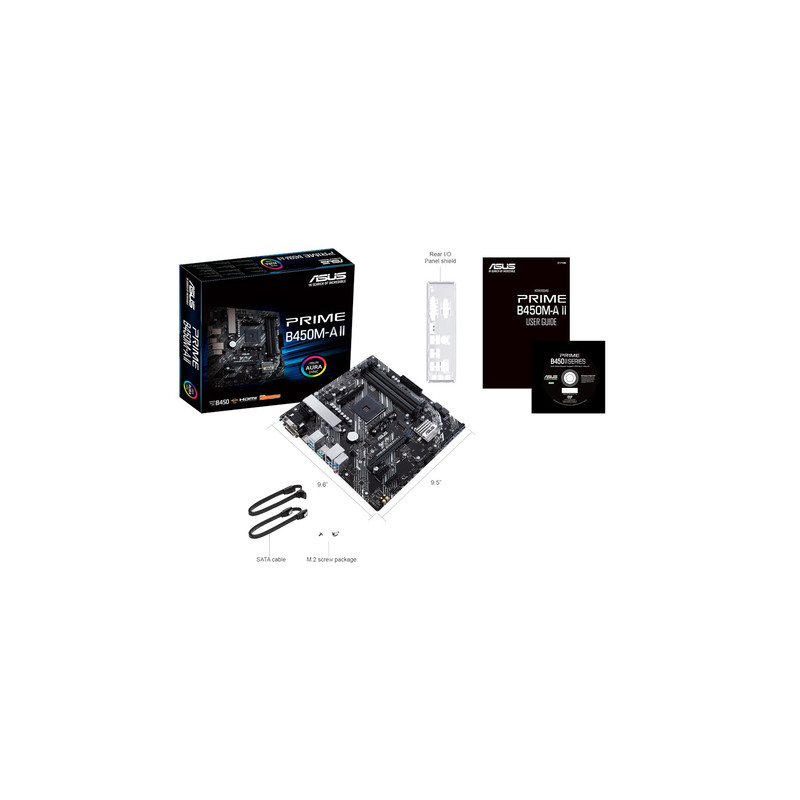 ASUS PRIME B450M-A II. Proizvođač procesora: AMD, Utor za procesor: Priključnice AM4, Kompatibilni procesori: AMD Ryzen 3, AMD Ryzen 5, AMD Ryzen 7, 3rd Generation AMD Ryzen 9. Podržani tipovi memorije: DDR4-SDRAM, Tip memorijskih utora: DIMM, Podržane brzine memorije: 2133,2400,2666,2800,3000,3200,3300,3400,3466,3600,3733,3866,4000,4400 MHz. Podržana sučelja pogona za pohranu: Serijski ATA III, Podržani tipovi pogona: HDD & SSD. HDMI inačica: 2.0b. Vrsta Ethernet sučelja: Gigabit Ethernet, LAN kontroler: Realtek RTL8111H