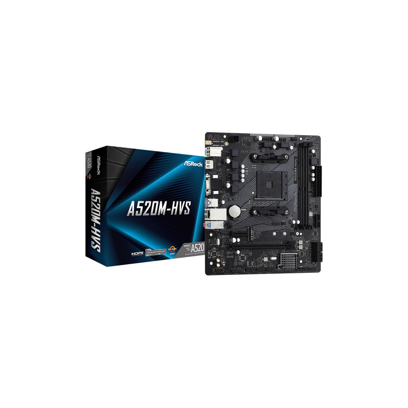 Asrock A520M-HVS. Proizvođač procesora: AMD, Utor za procesor: Priključnice AM4, Kompatibilni procesori: AMD Ryzen 3 3rd Gen, 3rd Generation AMD Ryzen 5, 3rd Generation AMD Ryzen 7, 3rd Generation AMD.... Podržani tipovi memorije: DDR4-SDRAM, Tip memorijskih utora: DIMM, Podržane brzine memorije: 2133,2400,2666,2933,3200,3466,3600,3733,3800,3866,4000,4133,4200,4266,4333,4400,4466,4500,4533 MHz. Podržana sučelja pogona za pohranu: M.2, Serijski ATA III. Skupina kojoj pripada grafički adapter: AMD, Grafička kartica: Radeon Vega. Vrsta Ethernet sučelja: Gigabit Ethernet, LAN kontroler: Realtek RTL8111H