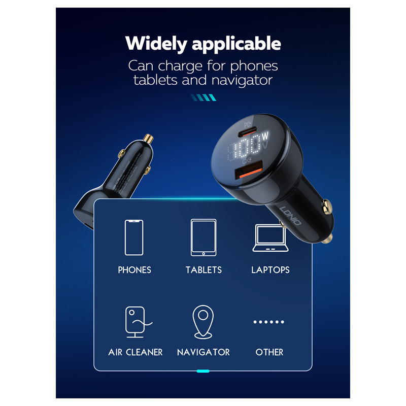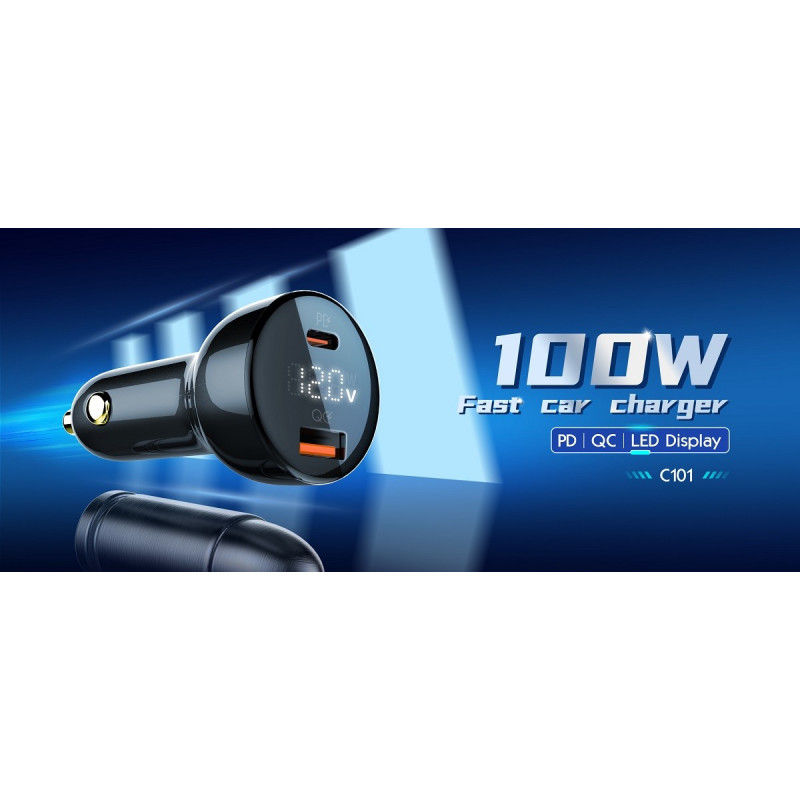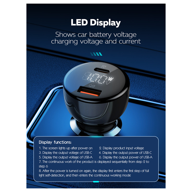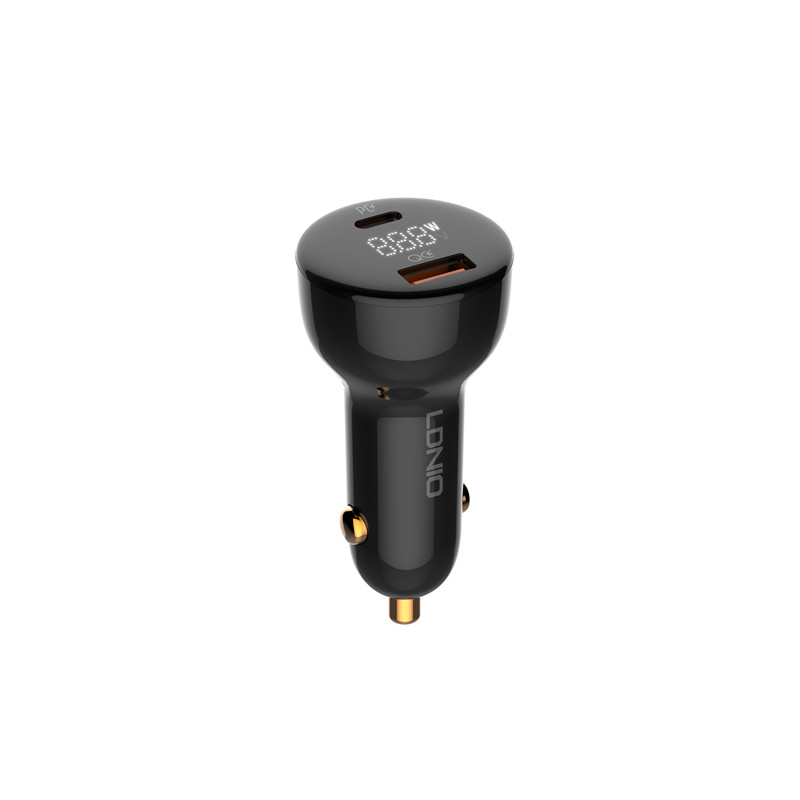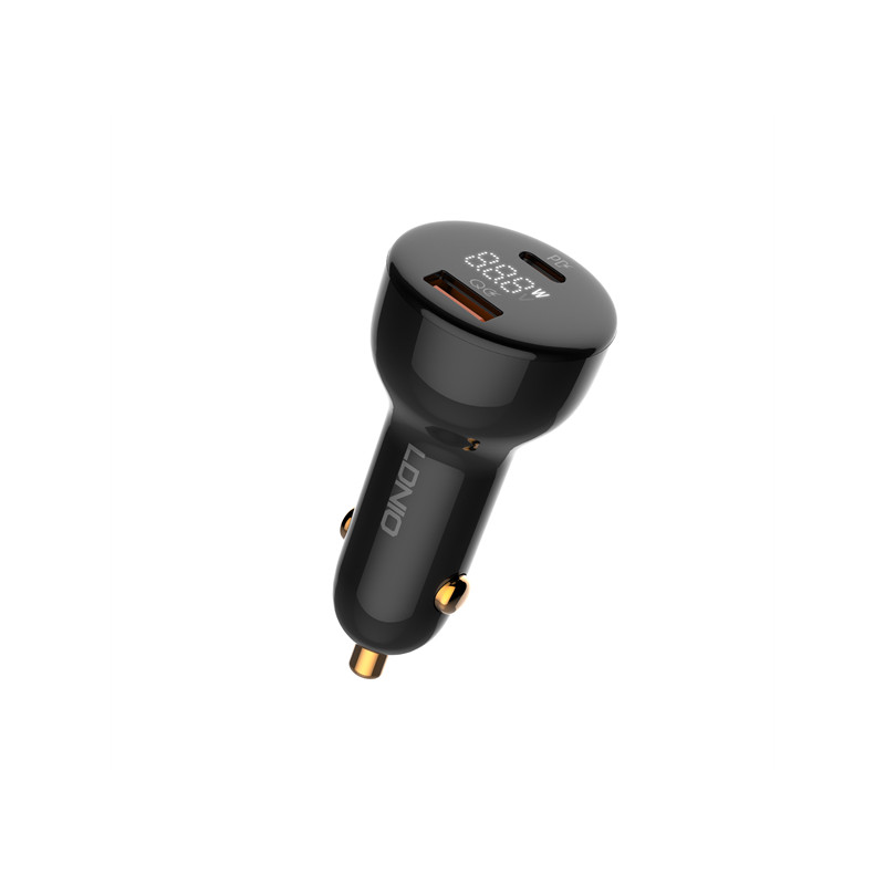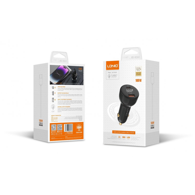 LDNIO CAR CHARGER 2 PORT (1A1C) 100W 5V 3A C101 je auto punjač sa LED zaslonom. Značajke: Dva izlaza, 1x USB i 1x USB-C, ukupne snage 100 W S LED zaslonom Kompaktna veličina Za punjenje mobilnih telefona Visokokvalitetni vatrostalni PC materijal, sprječava gorenje, siguran za korištenje. Tip konektora USB Type-C, USB Type-A Ulazni napon 12 volti (DC) Težina 150 grama