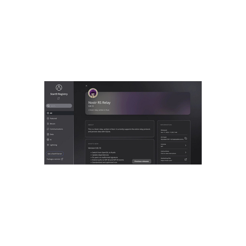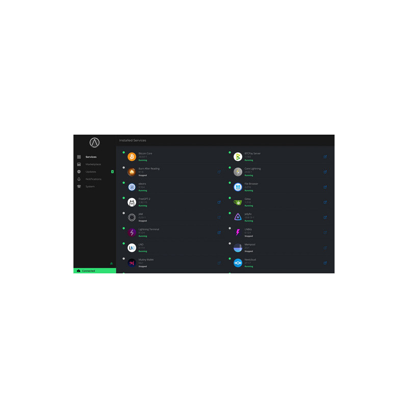 Start9 podržava niz različitih usluga u verziji otvorenog koda. Možete pokretati vlastite verzije usluga sličnih Dropboxu, iPhotu, Lastpassu, iMessageu, GitHubu i mnogim drugima. Mnoge aplikacije dostupne su na Start9 Marketplaceu.