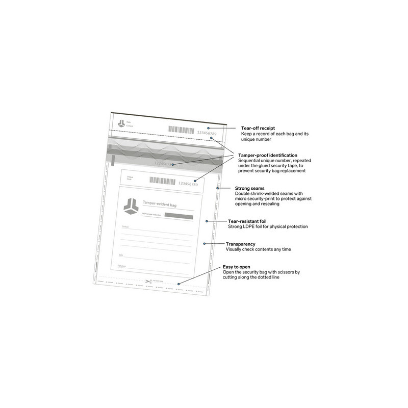 Svaka vrećica je numerirana jedinstvenim brojem na preklopu i na vrećici. Pločica se može otkinuti i koristiti za evidenciju sadržaja ili dokaz o vlasništvu.