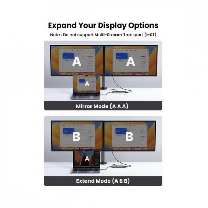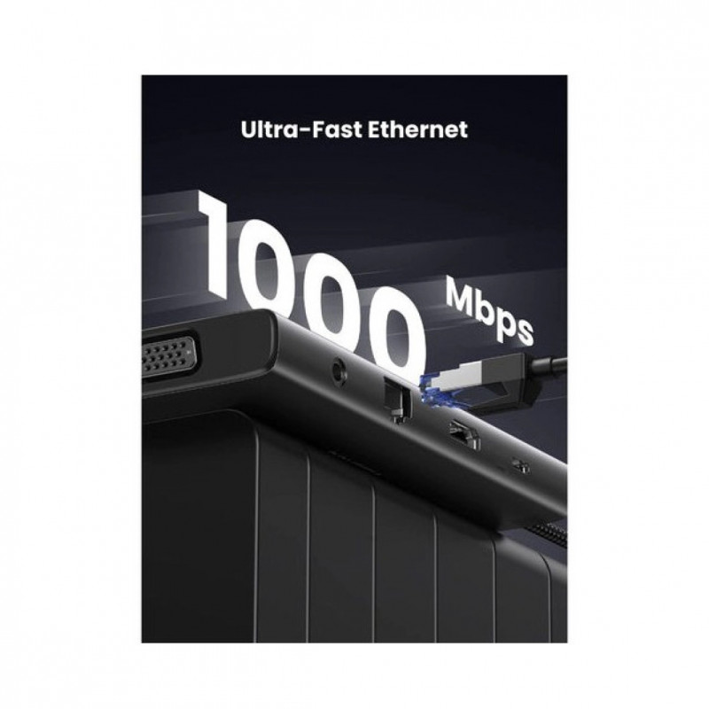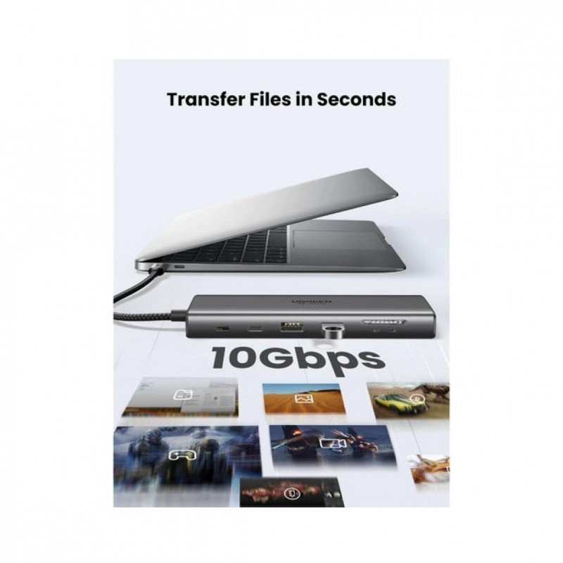 USB C razdjelnik s 11 priključaka: UGREEN 11-u-1 USB-C čvorište svestrano je i snažno rješenje za povezivanje koje proširuje funkcionalnost vašeg uređaja. Opremljeno s 2 USB-C 3.2 priključka, 2 USB-A 3.2 priključka, 1 USB-A 3.0 priključkom, HDMI-jem, VGA-om, RJ45 Gigabit Ethernetom, SD i TF čitačem kartica te 3,5 mm AUX izlazom, ovo čvorište pruža sveobuhvatan skup priključaka za sve vaše vanjske uređaje.