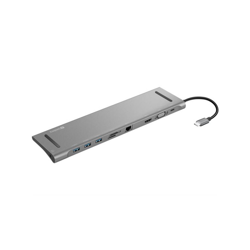 Sandberg USB-C 10-in-1 Docking Station - Aluminum case Input: USB-C Male Outputs: 1 x USB-C female (power supporting up to 100W), 1 x HDMI Female, 1 x VGA female, 3 x USB 3.0 A female, 1 x RJ45 female, 1 x Audio output 1 x SD card reader slot supporting SD SDHC SDXC MMC Micro SD TF card reader slot RJ45 connector supporting 10 100 1000 Mbps operation HDMI Resolution up to max 4K x 2K @ 30Hz VGA resolution up to 1920 x 1080P @ 60Hz Automatic recognition of monitor type, resolution and features Supports audio sample rate at 192 KHz 24bit Weight: 224g, Dimensions: 27.5 x 7.3 x 2.1 cm NOTE: Connection of display devices requires the USB-C port of your device to support Alt Mode.