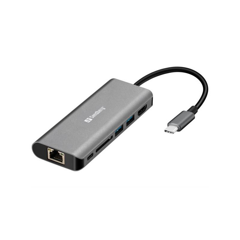 Sandberg USB-C Dock HDMI LAN SD USB,61W - Aluminum case, Input: USB-C Male (Compatible with USB 3.1 Gen. 1, USB 3.0, USB 2.0 and USB 1.1), Thunderbolt 3 Port Compatible, USB 3.0 A F support max 0.9A, 5 Gbps, Outputs: 1 x HDMI Female, 1 x USB-C female (power supporting up to 100W), 2 x USB 3.0 A female, 1 x RJ45 female, SD card reader slot supporting SD SDHC SDXC MMC Micro SD TF card reader slot, RJ45 connector supporting 10 100 1000 Mbps operation HDMI Resolution up to max 3840 X 2160P @ 30HZ Supports widescreen aspect ratio of 16:9 Full HD video streaming Supports desktop display mirror, extend mode, multi screen mode and screen rotation mode Automatic recognition of monitor type, resolution, and features NOTE: Connection of HDMI devices requires the USB-C port of your device to support HDMI Alt Mode.