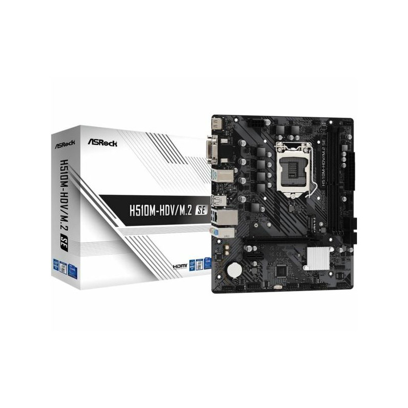 Asrock Intel LGA1200 H510M-HDV M.2 SE - Supports 10th Gen Intel Core Processors and 11th Gen Intel Core Processors Supports DDR4 2933MHz (OC) 1 x PCIe 4.0 x16, 1 x PCIe 3.0 x1 Graphics Output Options: HDMI, DVI-D, D-Sub 7.1 CH HD Audio (Realtek ALC897 Audio Codec) 4 SATA3, 1 x Ultra M.2 (PCIe Gen3 x4 SATA3) 6 x USB 3.2 Gen1 (4 x Rear, 2 x Front) 6 x USB 2.0 (2 x Rear, 4 x Front) Realtek Gigabit LAN