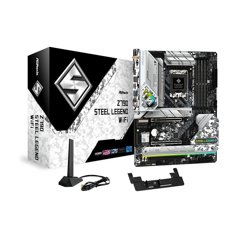 Asrock Intel LGA1700 Z790 STEEL LEGEND WIFI - Supports 14th, 13th Gen 12th Gen Intel Core Processors 16 1 1 Phase Power Design, SPS for VCore GT 4 x DDR5 DIMMs, supports up to 6800 (OC) 1 PCIe 5.0 x16, 1 PCIe 4.0 x16, 1 PCIe 3.0 x16, 1 M.2 Key-E for WiFi Graphics Output Options: 1 HDMI, 1 DisplayPort, eDP 7.1 CH HD Audio (Realtek ALC897 Audio Codec), Nahimic Audio 1 Blazing M.2 (PCIe Gen5x4), 4 Hyper M.2 (PCIe Gen4x4), 8 SATA3 1 USB 3.2 Gen2x2 Type-C (Front), 1 USB 3.2 Gen2 Type-C (Rear), 1 USB 3.2 Gen2 Type-A (Rear), 12 USB 3.2 Gen1 (8 Rear, 4 Front), 3 USB 2.0 (3 Front) Realtek 2.5G LAN 802.11ax Wi-Fi 6E Bluetooth