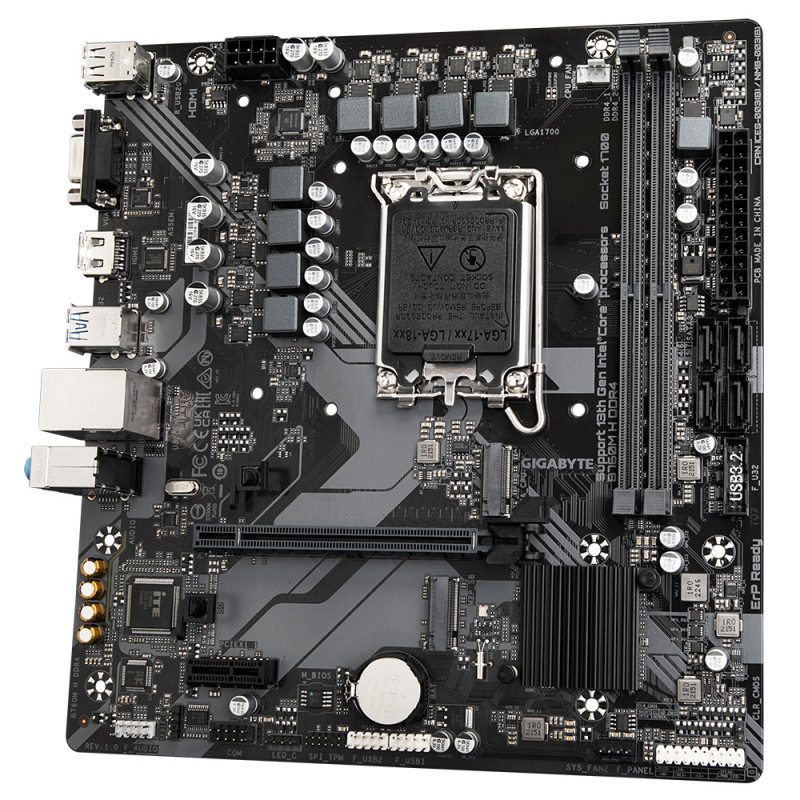 Gigabyte B760M H DDR4 (rev. 1.0). Proizvođač procesora: Intel, Utor za procesor: LGA 1700, Kompatibilni procesori: Intel® Celeron®, Intel® Pentium® Gold. Podržani tipovi memorije: DDR4-SDRAM, Maksimalna količina interne memorije: 64 GB, Tip memorijskih utora: DIMM. Podržana sučelja pogona za pohranu: M.2, SATA III, RAID tipovi: 0, 1, 5, 10. Vrsta Ethernet sučelja: Gigabit Ethernet. Komponenta za: PC/osobno računalo, Dimenzije matične ploče: Mikro ATX, Obitelj čipseta matične ploče: Intel