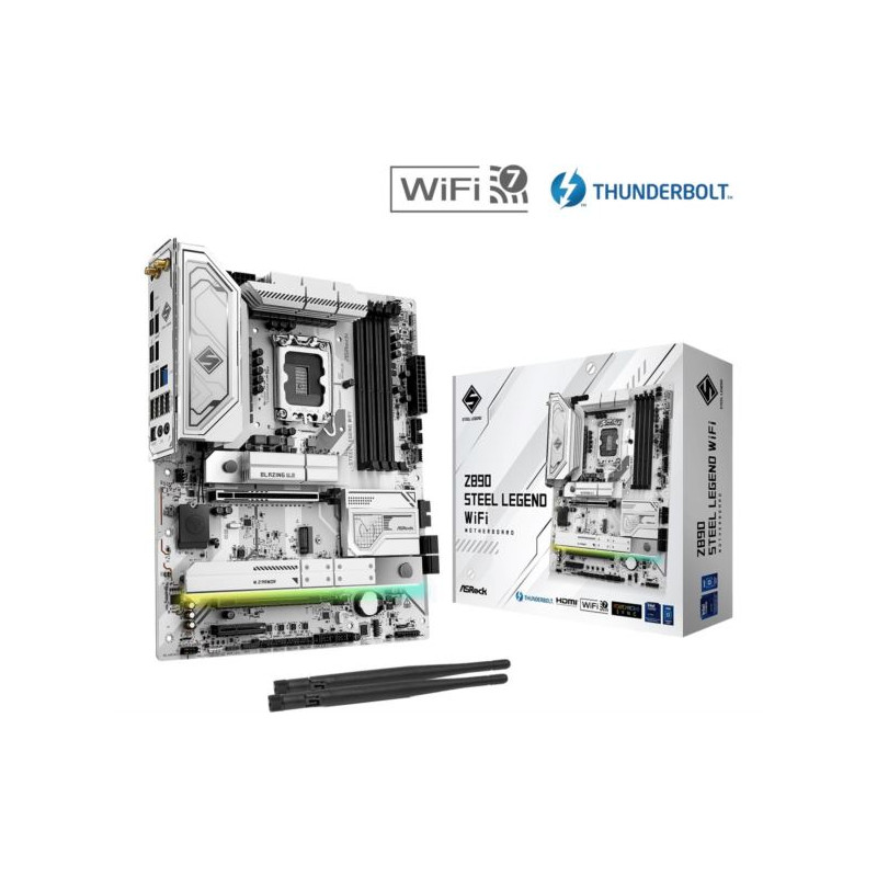 Asrock Intel LGA1851 Z890 STEEL LEGEND WIFI - Supports Intel Core Ultra Processors (Series 2) (LGA1851) 18 1 1 1 1 Power Phase, 80A SPS for VCore GT SA 4 x DDR5 DIMMs Supports Dual Channel, up to 9466 (OC) 1 PCIe 5.0 x16, 1 PCIe 4.0 x16, 1 PCIe 4.0 x4 Graphics Output Options: 1 HDMI, 2 Thunderbolt 4 Type-C Realtek ALC1220 7.1 CH HD Audio Codec Nahimic Audio 4 SATA3 1 Blazing M.2 (PCIe Gen5 x4), 2 Hyper M.2 (PCIe Gen4 x4), 1 Hyper M.2 (PCIe Gen4 x4 SATA3) 2 Thunderbolt 4 Type-C (Rear), 1 USB 3.2 Gen2x2 Type-C (Front), 2 USB 3.2 Gen2 Type-A (Rear), 8 USB 3.2 Gen1 (4 Rear, 4 Front), 6 USB 2.0 (2 Rear, 4 Front) Realtek 2.5G LAN Intel 802.11be Wi-Fi 7 Bluetooth Supports BIOS Flashback, Memory OC Shield, 20K Caps with 1000uF Capacitance
