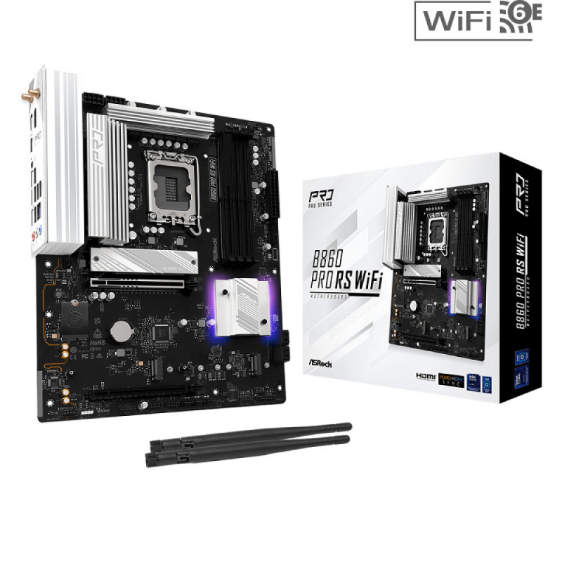 Asrock Intel LGA1851 B860 PRO RS WIFI - Supports Intel Core Ultra Processors (Series 2) (LGA1851) 10 1 1 1 1 Power Phase, Dr.MOS for VCore GT SA 4 x DDR5 DIMMs, Supports Dual Channel, up to 8666 (OC) 1 PCIe 5.0 x16, 1 PCIe 4.0 x16 Graphics Output Options: 1 HDMI, 1 DisplayPort Realtek ALC897 7.1 CH HD Audio Codec, Nahimic Audio 4 SATA3, 1 Blazing M.2 (PCIe Gen5x4), 2 Hyper M.2 (PCIe Gen4x4) 1 USB 3.2 Gen2x2 Type-C (Rear), 1 USB 3.2 Gen1 Type-C (Front), 8 USB 3.2 Gen1 (6 Rear, 2 Front), 6 USB 2.0 (2 Rear, 4 Front) Realtek 2.5G LAN 802.11axe Wi-Fi 6E Bluetooth Supports BIOS Flashback, M.2 Bottom Heatsink