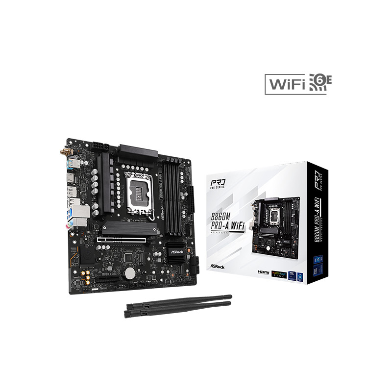 Asrock Intel LGA1851 B860M PRO-A WIFI - Supports Intel Core Ultra Processors (Series 2)(LGA1851) 10 1 1 1 1 Power Phase, Dr.MOS for VCore GT SA 4 x DDR5 DIMMs Supports Dual Channel, up to 8666 (OC) 1 PCIe 5.0 x16, 1 PCIe 4.0 x4 Graphics Output Options: 1 HDMI, 1 DisplayPort Realtek ALC897 7.1 CH HD Audio Codec 4 SATA3, 1 Blazing M.2 (PCIe Gen5x4), 2 Hyper M.2 (PCIe Gen4x4) 1 USB 3.2 Gen2x2 Type-C (Rear), 1 USB 3.2 Gen1 Type-C (Front), 5 USB 3.2 Gen1 (3 Rear, 2 Front), 6 USB 2.0 (2 Rear, 4 Front) Realtek 2.5G LAN 802.11axe Wi-Fi 6E Bluetooth Supports BIOS Flashback