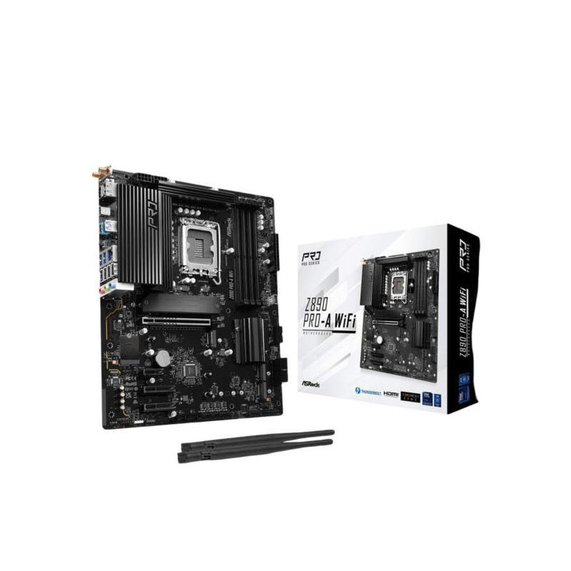Asrock Intel LGA1851 Z890 PRO-A WIFI - Supports Intel Core Ultra Processors (Series 2)(LGA1851) 16 1 1 1 1 Power Phase, Dr.MOS for VCore GT 4 x DDR5 DIMMs Supports Dual Channel, up to 9066 (OC) 1 PCIe 5.0 x16, 2 PCIe 4.0 x4, 1 PCIe 4.0 x1 Graphics Output Options: 1 HDMI, 1 DisplayPort, 1 Thunderbolt 4 USB4 Type-C Realtek ALC897 7.1 CH HD Audio Codec 4 SATA3, 1 Blazing M.2 (PCIe Gen5x4), 2 Hyper M.2 (PCIe Gen4x4), 1 Hyper M.2 (PCIe Gen4x4 SATA3) 1 Thunderbolt 4 USB4 Type-C (Rear), 2 USB 3.2 Gen2x2 Type-C (1 Rear, 1 Front), 1 USB 3.2 Gen2 Type-A (Rear), 6 USB 3.2 Gen1 (2 Rear, 4 Front), 8 USB 2.0 (4 Rear, 4 Front) Realtek 2.5G LAN 802.11axe Wi-Fi 6E Bluetooth Supports BIOS Flashback, Memory OC Shield, Durable Caps with 1000uF Capacitance