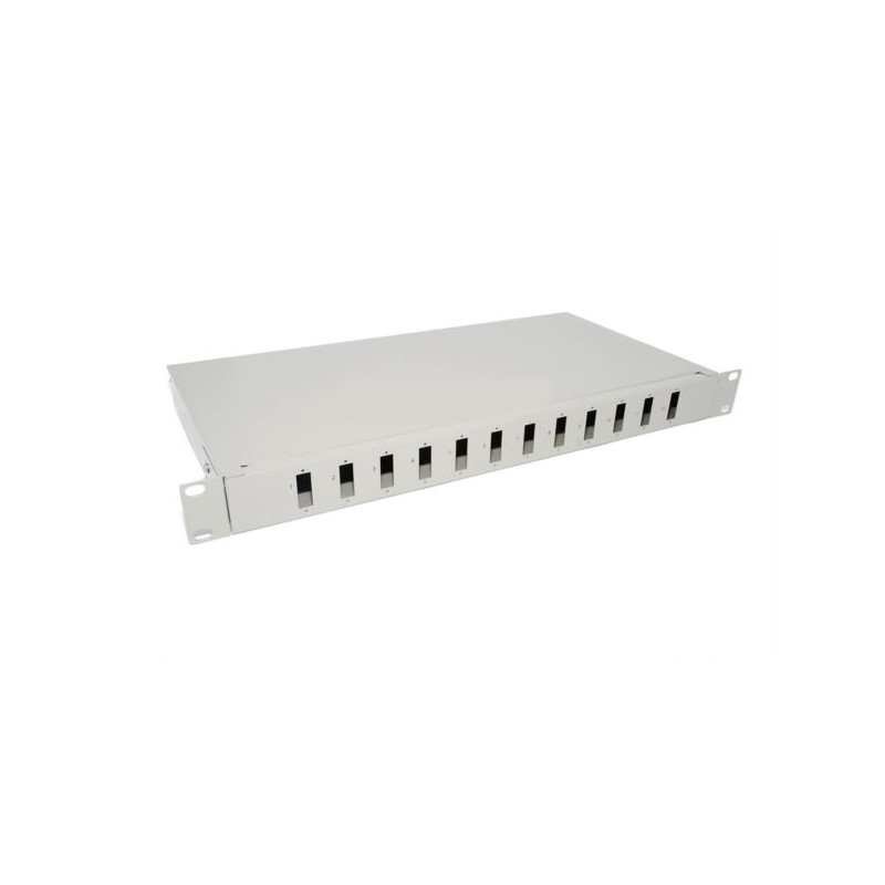 NFO Patch Panel 1U 19" - 12x SC Duplex, Closed, 1 cassette - Weight: 2 kg Number of trays: 1 Tray capacity: 12 24 welds Maximum number of adapters: 12 (SC Duplex) Maximum number of trays: 3 Material: Cold-rolled steel - powder painted in light grey Dimensions: Installation height: 1U (44.45 mm), Depth: 250 mm, Mounting method (length): 19 '' profile Diameter of holes on the back: Rubber 2x20 mm, for Cable gland: 2 x PG.13.5 Kit components: One fiber optic tray, Cable gland: 2 x PG.13.5, Mounting screws for adapters: 38 pcs, Plastic clamps: 2 pcs, Spare screws: 8pcs (small) and 2pcs (large), Spare nuts: 6pcs (small) and 3pcs (large), Splice covers: 1pack 24pcs