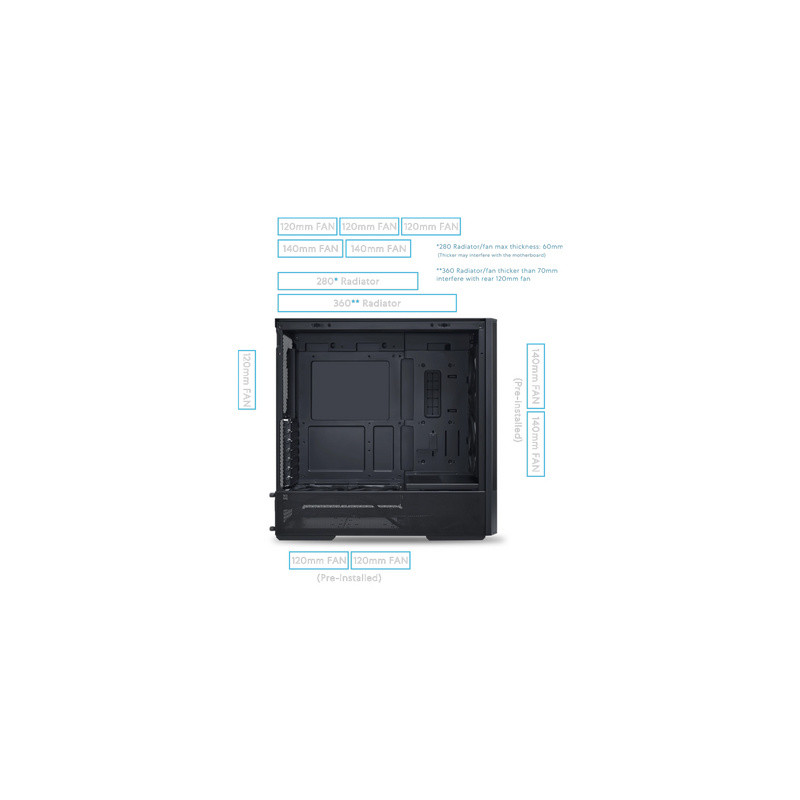 Prednja, donja i gornja strana izrađene su od mrežastih ploča. Kućište također ima 4 unaprijed instalirana ventilatora koji pružaju izvrsnu prozračnost i protok zraka za hlađenje komponenti. Laboratorij PPLP kućištu je također dodijelio nagradu za izvrsne toplinske performanse.