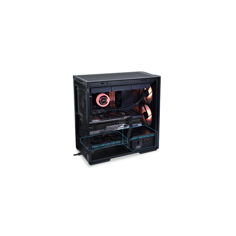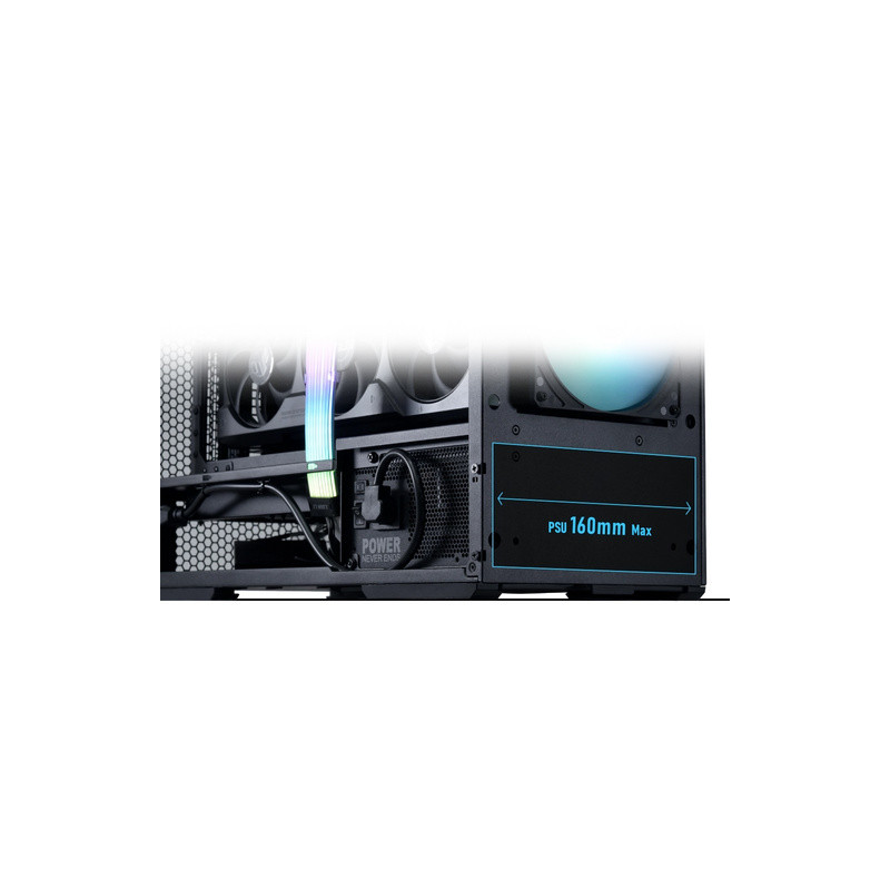 Ladica matične ploče omogućuje učinkovito hlađenje i odličan protok zraka. Napajanje je strateški postavljeno na prednjoj strani s bočnim ulazima za jednostavno spajanje kabela. Uključen je i nastavak za spajanje napajanja.