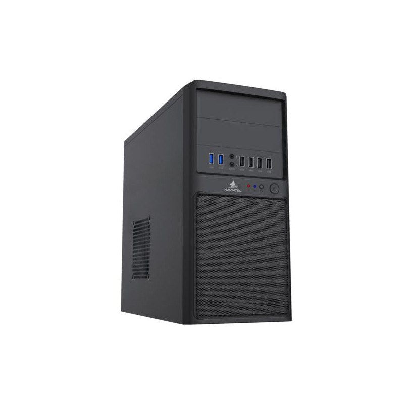 NaviaTec 6812-2U34U2 mATX Mid Tower PC Case - Front I O: 2x USB 3.0, 4x USB 2.0, 3.5mm Audio Dimension (Total): 368(L) x 173(W) x 365(H) mm Drive Bays: 1x 5.25", 4x 3.5" (Toolless), 2x 2,5" Metal Thickness: SGCC; 0,5mm Expansion Slots: 4 Slots Fits MB: Mini ATX, MicroATX PSU mount: top 1x 8cm fan in back