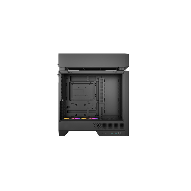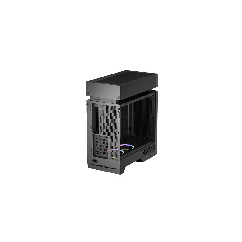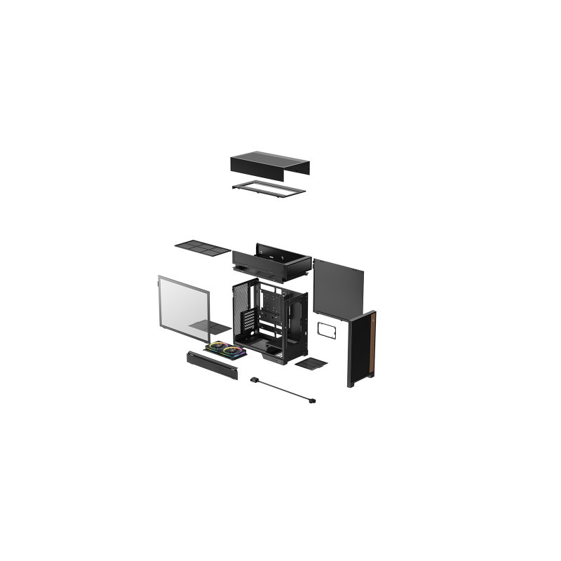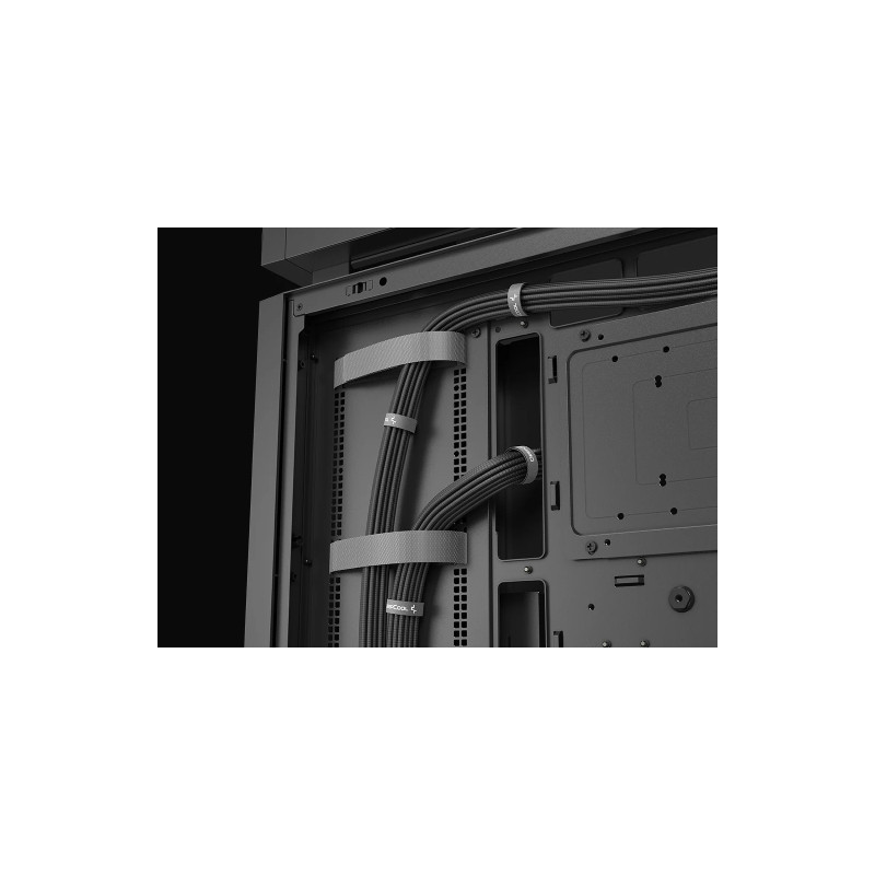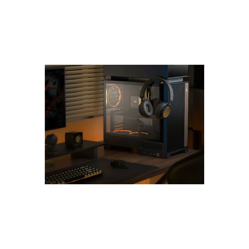 Kućište ima 35 mm prostora za kabel na stražnjoj strani, izvlačni držač za slušalice, a stranice se lako skidaju bez upotrebe alata. Uključen je nosač grafičke kartice, a napajanje ima mjesto na prednjoj strani kućišta. Prednja strana ima 2× USB-A 3.0, 1× USB-C i priključak za slušalice.