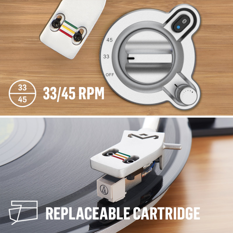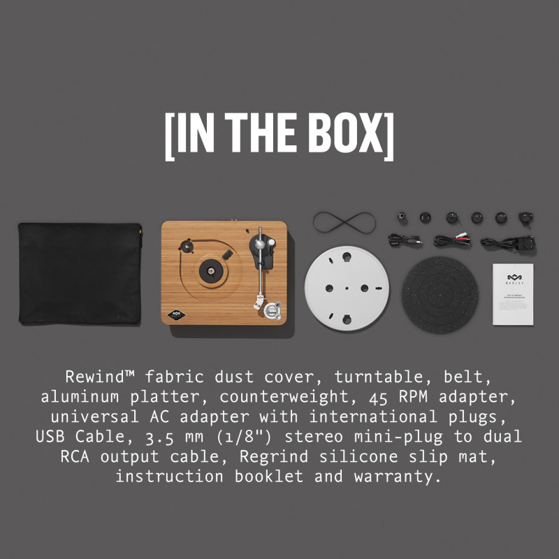 Bežični gramofon Stir It Up nudi elegantan dizajn izrađen od čvrstog bambusa, silikona REGRIND ™, tkanine REWIND tkanine, reciklirane plastike i recikliranog aluminija. Uživajte u klasičnom zvučnom sustavu koji se bežično povezuje sa bilo kojim Bluetooth® zvučnikom i nudi ugrađeno pretpojačalo koje pruža besprijekornu kompatibilnost s Marley zvučnicima ili kućnim prijamnicima. Stir It Up Wireless uključuje USB ulaz za snimanje na računalo, RCA izlaz i 3,5 mm priključak za slušalice. Glavne značajke: Čvrsta baza od bambusa Performanse Bluetooth® v4.2 Izmjenjiva glava AT3600L Snimanje na računalo s USB vezom Automatsko pokretanje / zaustavljanje remenskog pogona Ugrađeno pretpojačalo 3,5 mm AUX izlaz RCA (fono / linijski) Brzine od 45 i 33 o / min Održivi dizajn: Bežični gramofon Stir It Up izrađen je od bambusa, premotane tkanine i silikona REGRIND. Tkanina Marley REWIND izrađena je od recikliranih materijala, stvarajući trajni, visokokvalitetni proizvod. Napravljen je od tipične mješavine 30% recikliranog organskog pamuka, 30% reciklirane konoplje i 40% recikliranog PET-a. Bluetooth mogućnost: Budite u prvom planu s najnovijim Bluetooth mogućnostima. Jednostavna tipka za uparivanje i tipka za kontrolu glasnoće omogućuju glatku vezu i bolje performanse. Snimanje na računalo s USB vezom: Bežični gramofon Stir It Up ima USB funkciju snimanja na računalu ili Macu, tako da možete snimati i digitalizirati vinilnu glazbu. Gramofon možete povezati s računalom putem USB veze na uređaju za reprodukciju i glazbu spremiti u digitalnu datoteku. Ovu datoteku možete prenijeti na prijenosno računalo, telefon ili bilo koji prijenosni medijski uređaj kako biste u pokretu mogli slušati glazbu iz svoje kolekcije vinila! Tehnički podaci: Dimenzije proizvoda: 40 x 40 x 8 cm; 6 kg Težina proizvoda u kutiji: 6,6 kg