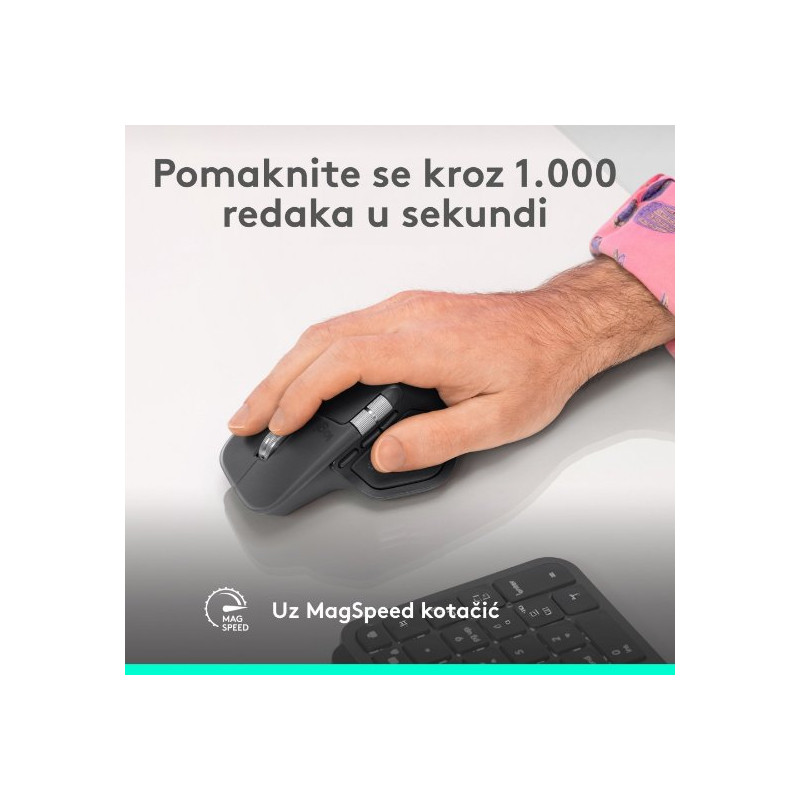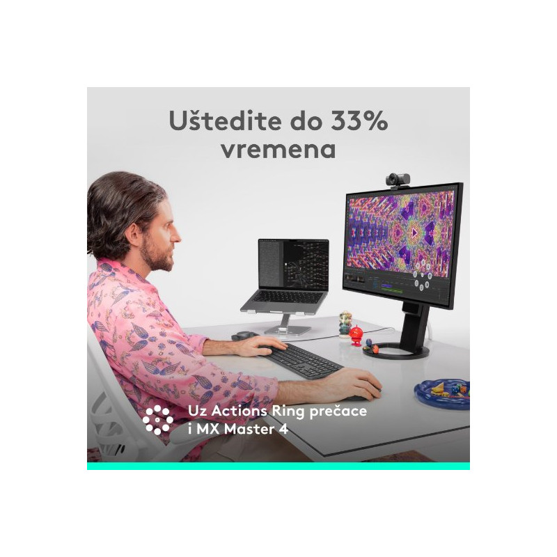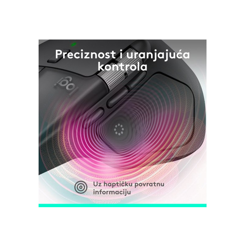 Upoznajte MX Master 4 koji donosi uranjajuću kontrolu i preciznost koju možete osjetiti zahvaljujući prilagodljivom haptičkom povratnom odzivu za određene radnje. Uštedite do 33 % svog vremena uz prečace Actions Ring i MX Master 4, omogućujući pristup alatima i filtrima izravno na mjestu pokazivača.