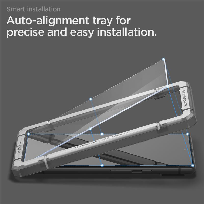 Spigen Glas.tR AlignMaster 2 Pack - Tempered glass durability rated at 9H hardness - Includes an innovative, auto-alignment installation tray for effortless application - Oleophobic coating ensures the surface to remain fingerprint-free, touch-responsive and clear just as its original screen - Compatible with Spigen cases