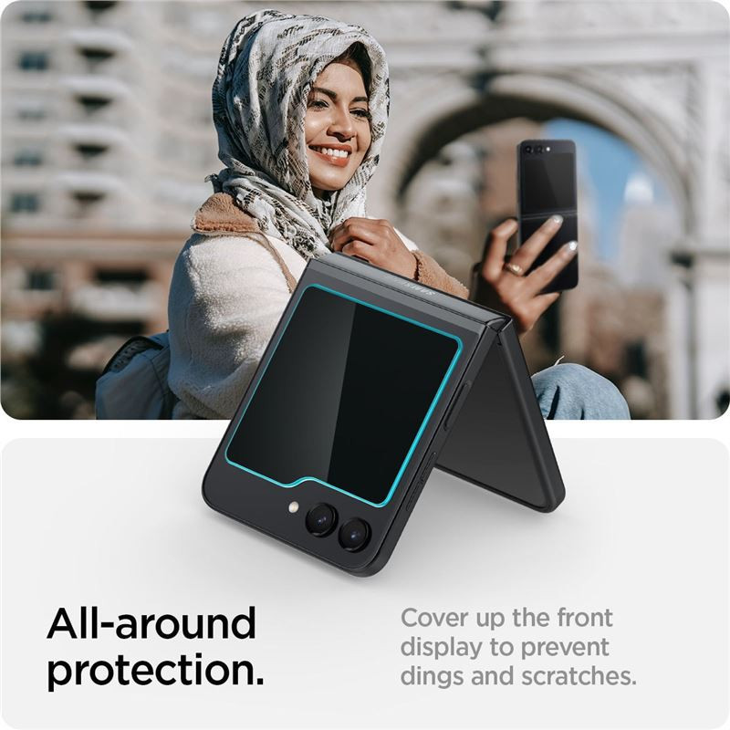 - Be a hero. Save your screen and your time. The EZ Fit takes the struggle away from installing a screen protector on your Galaxy Z Flip 5’s unique front display. Use the tray to align the screen protector on your Flip5, press down, and you’re good to go. Easy does it. - Made from 9H tempered glass for durability - EZ Fit tray included for precise and easy installation - Includes two front display protectors and a cleaning kit - Oleophobic coating for daily fingerprint resistance - Compatible with all Spigen cases for the Galaxy Z Flip5