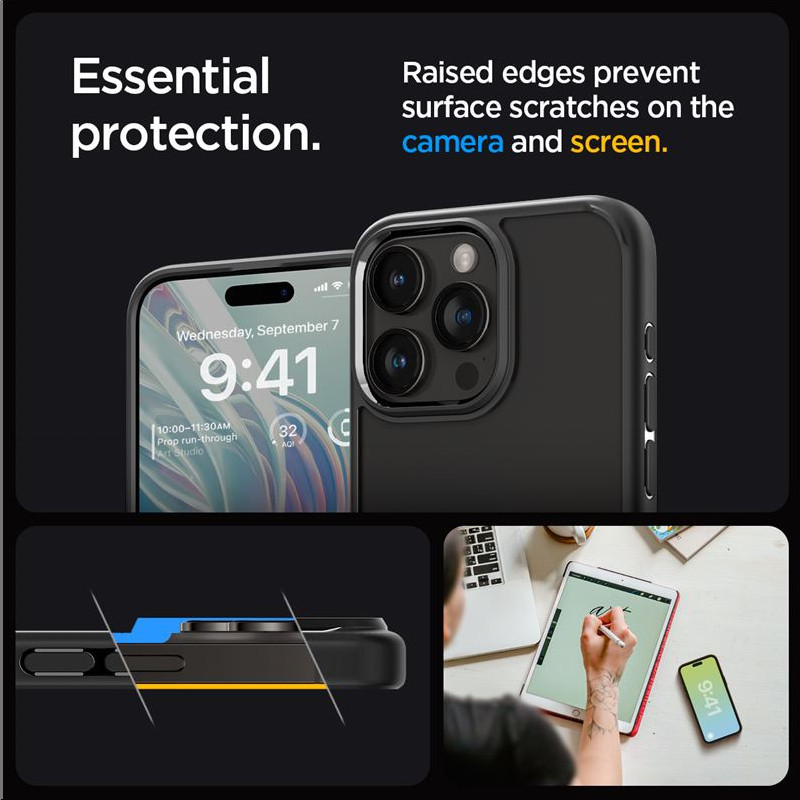 Značajke - Hibridni dizajn izrađen od kruteg i fleksibilnog odbojnika - Podignuti okviri podignite zaslon i kamera s ravnih površina - Zaštita od pada putem tehnologije zračnog jastuka - Precizni izrezi i taktilni gumbi osiguravaju brz pristup i povratne informacije - Bežično punjenje kompatibilno - Materijal: TPU + PC