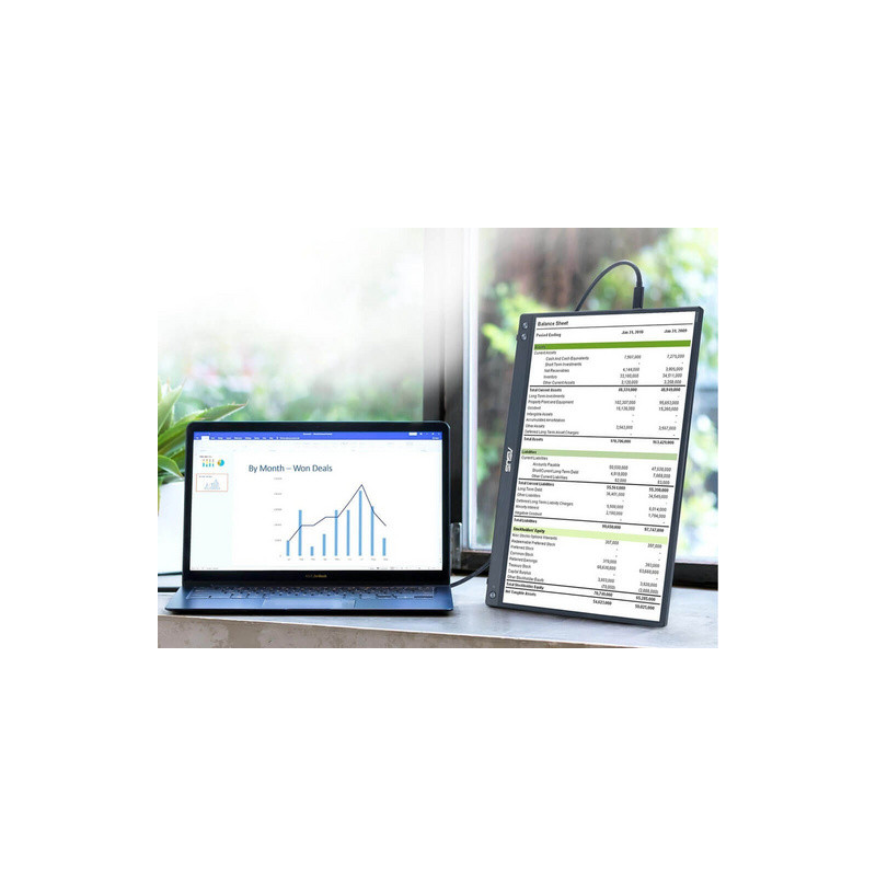 Pomoću ASUS DisplayWidget Centra, ZenScreen MB16AHV može automatski prepoznati svoju orijentaciju i prebacivati se između pejzažnog i portretnog načina rada. Pejzažni način rada savršen je za proračunske tablice i prezentacije, dok portretni način rada olakšava čitanje dokumenata, knjiga i web stranica.
