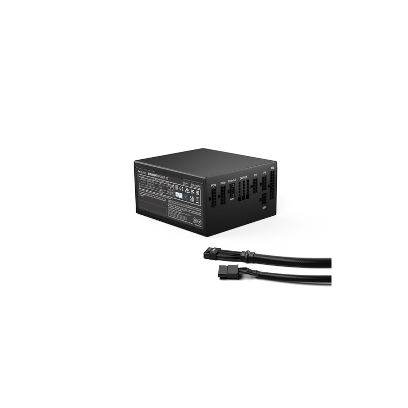 be quiet! BN338. Ukupna snaga: 1000 W, Ulazni napon izmjenične struje: 100 - 240 V, Vršna snaga: 1070 W. Poveznik napajanja matične ploče: 20+4 pin ATX, Duljina kabela napajanja matične ploče: 60 cm, Duljina kabela SATA napajanja: 550,700,850,1000 mm. Svrha: PC/osobno računalo, Faktor forme uređaja za napajanje (PSU): ATX, Certifikat 80 PLUS: 80 PLUS Platinum. Boja proizvoda: Crno, Tip hlađenja: Aktivno, Promjer ventilatora: 13,5 cm. Priloženi kabeli: CPU, SATA