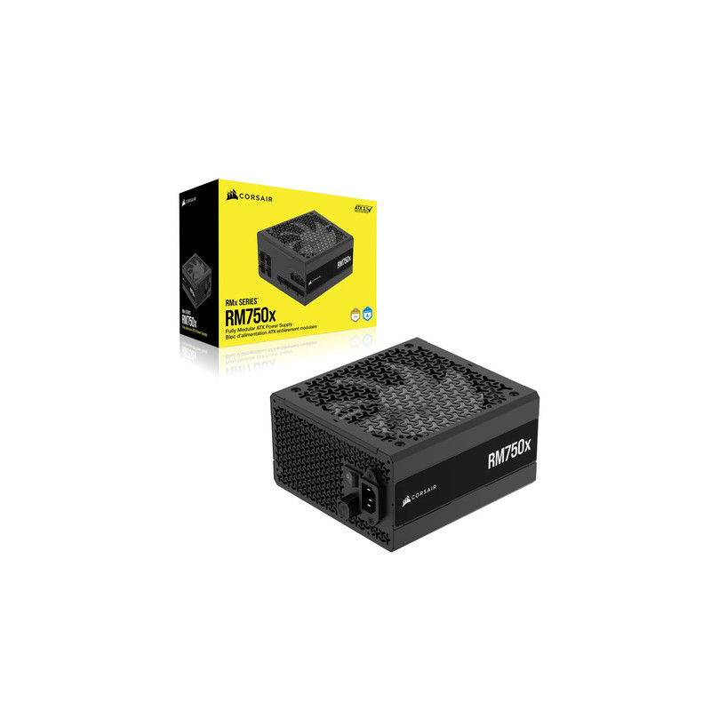 Corsair RM750x. Ukupna snaga: 750 W, Ulazni napon izmjenične struje: 100 - 240 V, Ulazna frekvencija izmjenične struje: 47 - 63 Hz. Poveznik napajanja matične ploče: 24-pin ATX, Vrsta kabliranja: Potpuno modularni. Svrha: PC/osobno računalo, Faktor forme uređaja za napajanje (PSU): ATX, Certifikat 80 PLUS: 80 PLUS Gold. Boja proizvoda: Crno, Tip hlađenja: Aktivno, Promjer ventilatora: 14 cm. Širina: 150 mm, Dubina: 160 mm, Visina: 86 mm