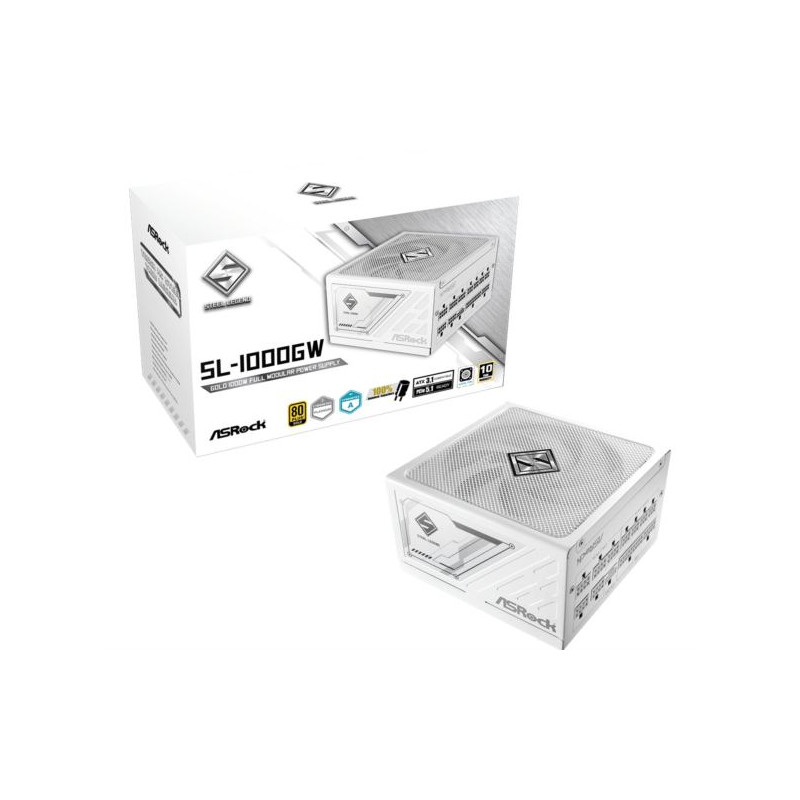 ASRock PSU Steel Legend SL-1000GW, 1000W, 80 Gold, Fully Modular, White - 80 PLUS GOLD Certified Cybenetics PLATINUM and LAMBDA A Certified ATX3.1 PCIe5.1 Ready Fully Modular Cable Design Native 12V-2x6 Connector Dual Color Design 100% Highly Reliable Japanese Capacitors 135mm Striped Axial FDB Fan iCool Intelligent Fan Control Mode Built-in 5V BOOST function Remarkable 10-Year Warranty Dimensions(L x W x H): 150mm x 150mm x 86mm Flat cables