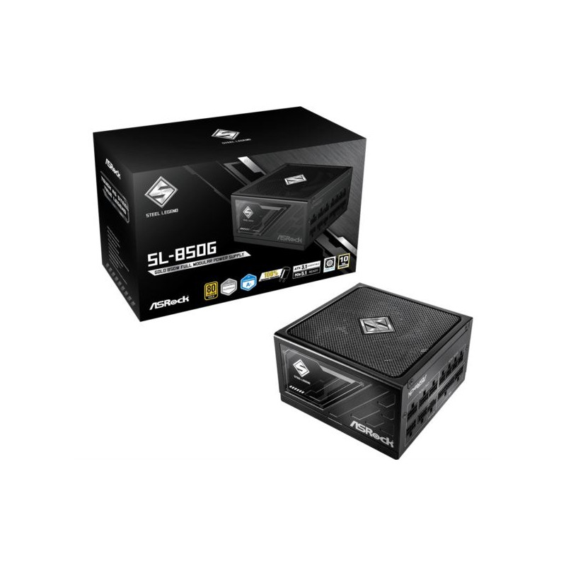 ASRock PSU Steel Legend SL-850G, 850W, 80 Gold, Fully Modular - 80 PLUS GOLD Certified Cybenetics PLATINUM and LAMBDA A Certified ATX3.1 PCIe5.1 Ready Fully Modular Cable Design Native 12V-2x6 Connector Dual Color Design 100% Highly Reliable Japanese Capacitors 135mm Striped Axial FDB Fan iCool Intelligent Fan Control Mode Built-in 5V BOOST function Remarkable 10-Year Warranty Dimensions(L x W x H): 150mm x 150mm x 86mm Flat cables