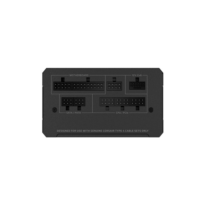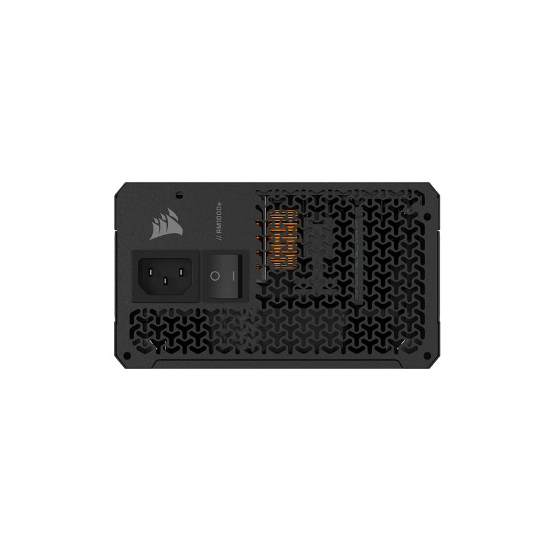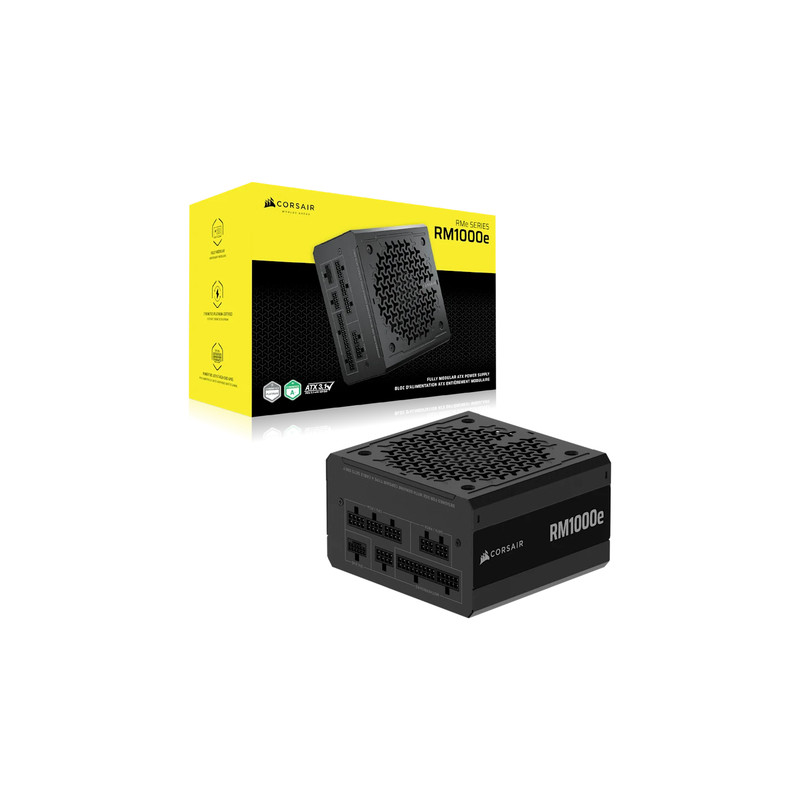 Corsair RMe Series RM1000e. Ukupna snaga: 1000 W, Ulazni napon izmjenične struje: 100 - 240 V, Ulazna frekvencija izmjenične struje: 47 - 63 Hz. Poveznik napajanja matične ploče: 24-pin ATX, Vrsta kabliranja: Potpuno modularni. Svrha: PC/osobno računalo, Faktor forme uređaja za napajanje (PSU): ATX, Certifikat 80 PLUS: 80 PLUS Gold. Boja proizvoda: Crno, Tip hlađenja: Aktivno, Promjer ventilatora: 12 cm. Potvrde o usklađenosti: CE, RoHS, UKCA