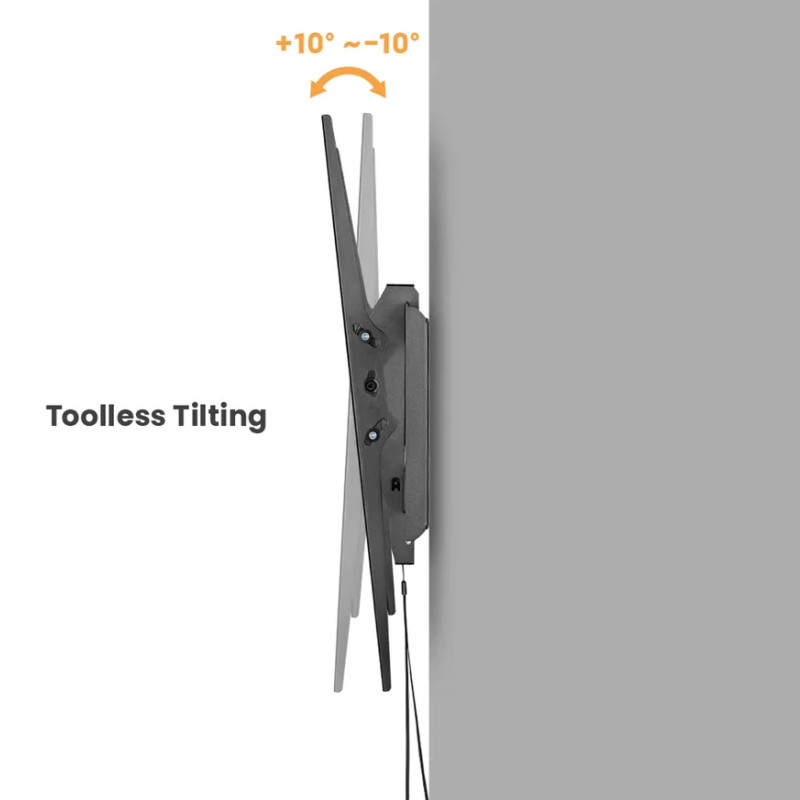 - Stable and tiltable TV wall mount with just 80mm wall distance - the load capacity is up to 120kg and the mount supports maximum VESA 900x600. - For screens from 60" to 120" (max. VESA 900x600) - Load capacity up to 120kg - Tiltable - Tilt range: -10° - +10° - Very small wall distance of 80mm - Securing against unintentional loosening of the mounting hooks - Integrated spirit level - Material: Steel - Color: Black - 80x1005x625mm (3.1"x39.6"x24.6") - Fits Curved TVs: Yes - Mounting Hole Pattern: VESA & Universal - Max. Mounting Hole: 965x602mm - Weight Capacity: 120kg - Profile: 80mm (3.1")