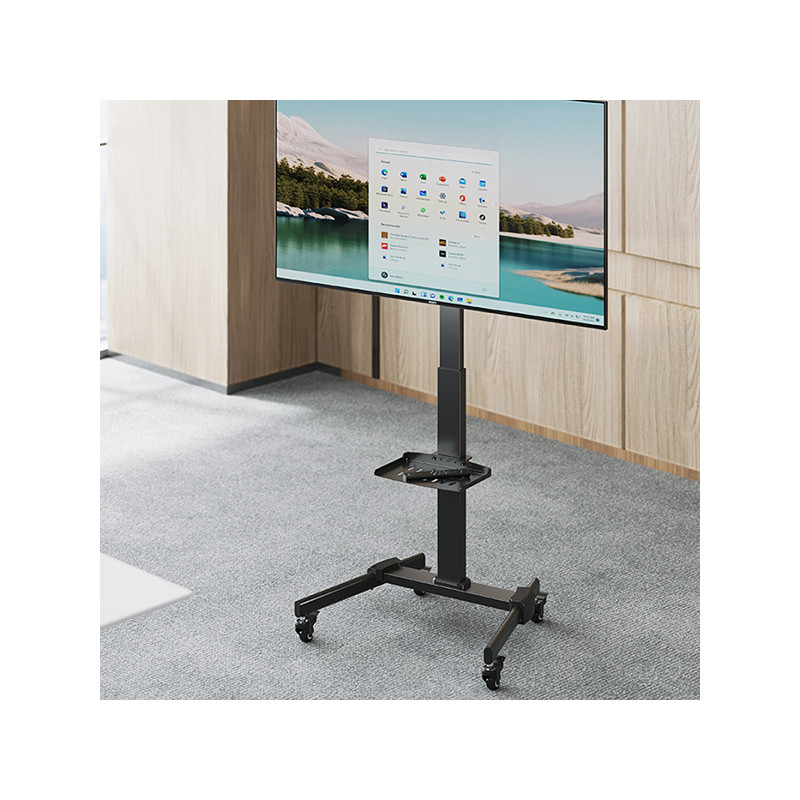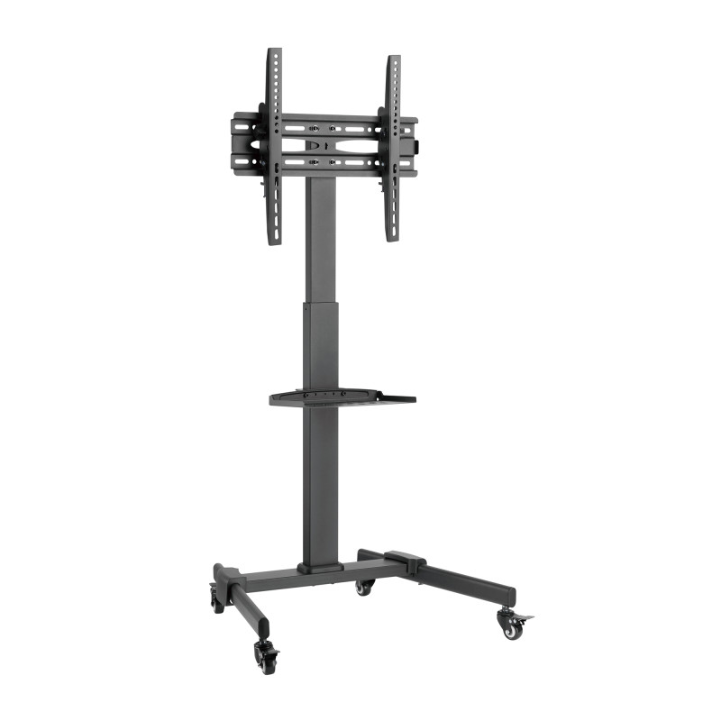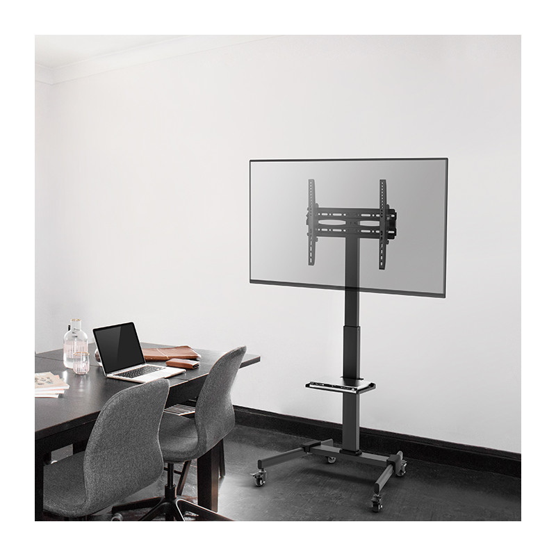 Svestrani podni TV stalak GUARD FS-55-T odgovara većini televizora od 32”-55”, u raznim ambijentima, uključujući domove, urede, konferencije, restorane, ugostiteljske objekte. Njegova VESA ploča koja se naginje bez alata može se nagnuti prema gore i dolje za 10° kako bi se zaslon pozicionirao za optimalno iskustvo gledanja. Brzootpuštajuća opružna brava omogućuje jednostavno podešavanje na željenu visinu. Također ima teleskopski dizajn stupa kako bi se smanjila veličina pakiranja radi uštede troškova dostave i skladištenja. Četiri kotačića koja se mogu zaključati omogućuju lako pomicanje TV kolica i štite pod od ogrebotina i oštećenja tijekom pomicanja ili zaustavljanja. Polica za opremu pruža dodatni prostor za pohra